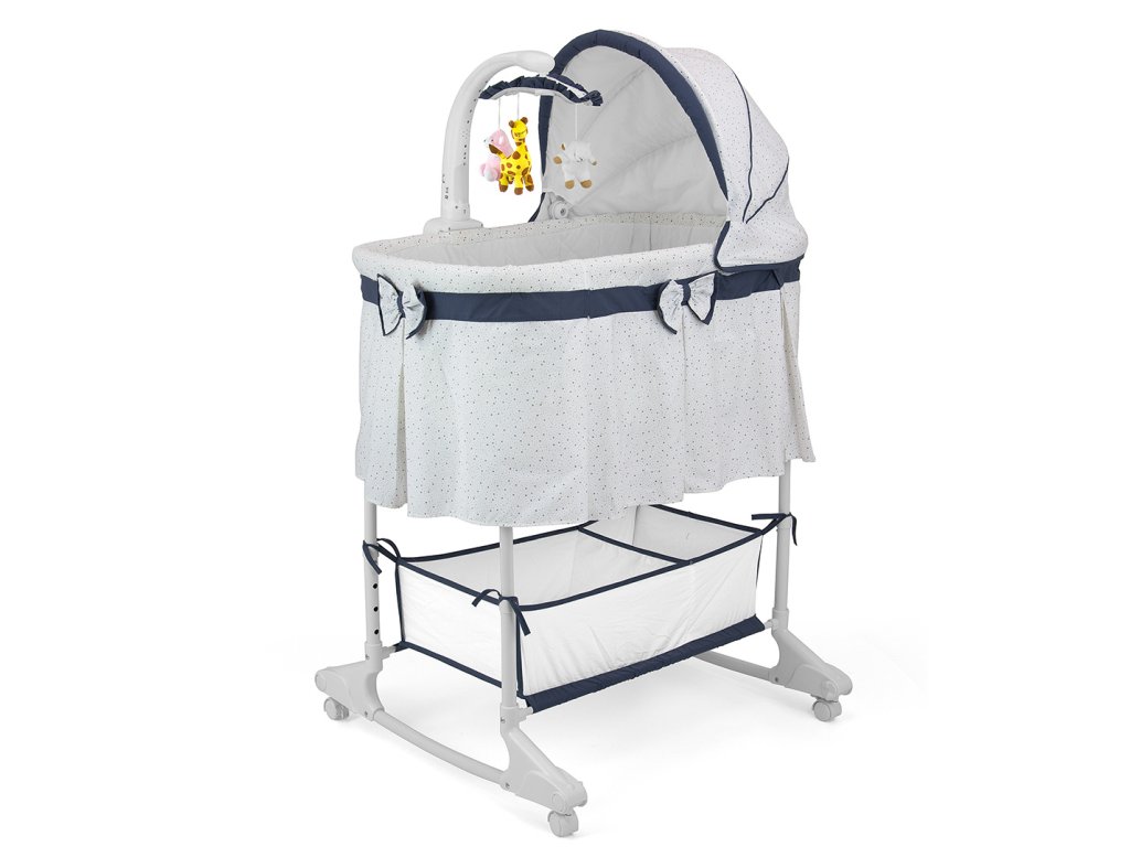 Krásna, detská multifunkčná kolíska a postieľka v jednom - 2 v 1 od Milly Mally. Vhodná pre bábätká od narodenia. Na spodnej časti hojdacích líšt sú kolieska, ktoré je možné jednoducho nadvihnúť a zablokovať, tým sa kolíska zmení na postieľku. Kolieska zaručujú jednoduchú manipuláciu s postieľkou. Vďaka veselému kolotoči s krásnymi plyšovými hračkami, melódiami a nočné lampičkou bude zaspávanie pre Vaše dieťatko príjemnejšie. Praktickým diaľkovým ovládačom možno jednoducho ovládať prehrávanie melódií a svetlo kolotoče. Výšku kolísky je možné nastaviť do 4 úrovní. Praktická sťahovacie bočnice uľahčuje prebaľovanie bábätka. Charakteristika: - nastavenie výšky do 4 polôh, - odnímateľná, regulovateľná strieška, - kolotoč s veselými plyšovými hračkami, melódií a nočné lampičkou, - možnosť regulácie intenzity svetla lampičky a hlasitosti prehrávaných melódií, - funkcia vibrácií, - praktický kôš na plienky a ďalšie príslušenstvo pre bábätko, - mäkká matrac súčasťou postieľky má nepremokavý poťah, výška cca 2 cm, - vonkajšie dekorácie s volánikom, - popruh pre spojenie s manželskou posteľou, - sťahovacie bočnice pre ľahšie prebaľovanie bábätka. poťah možno prať v práčke. Vhodná pre bábätká do 6 mesiacov (8 kg). Detailné rozmery: Rozmery: dĺžka: 87cm, šírka: 47cm, hĺbka: 27cm, výška: 135cm (regulovateľná). Rozmery vnútorné: cca 80x40cm. Napájanie kolotoče zaisťujú 3 batérie typu C (nie sú súčasťou). 1.jakost.
