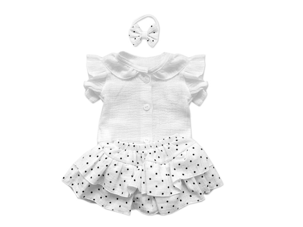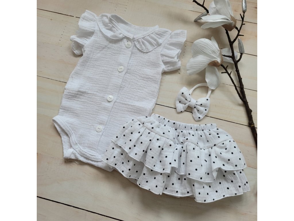 Mušelínová sukničkokraťásky, bodýčko a čelenka, 3D sada, bílá/dots