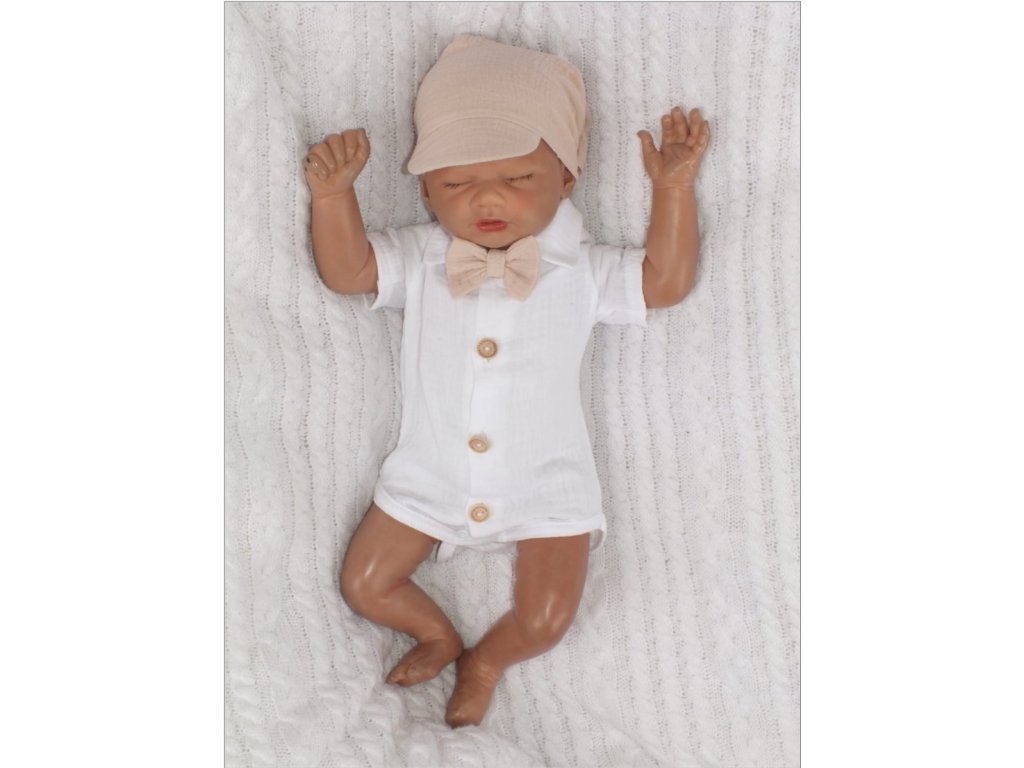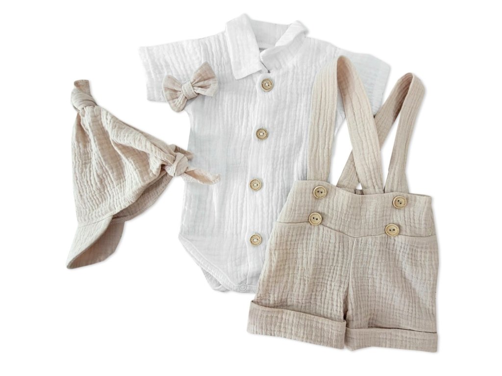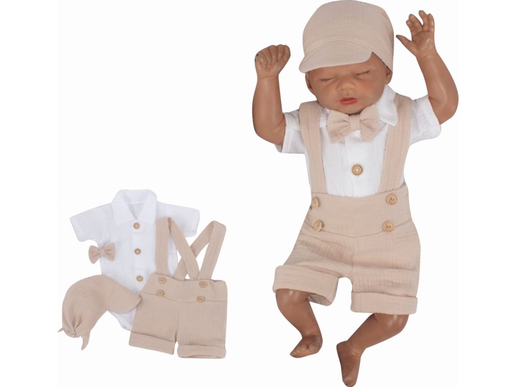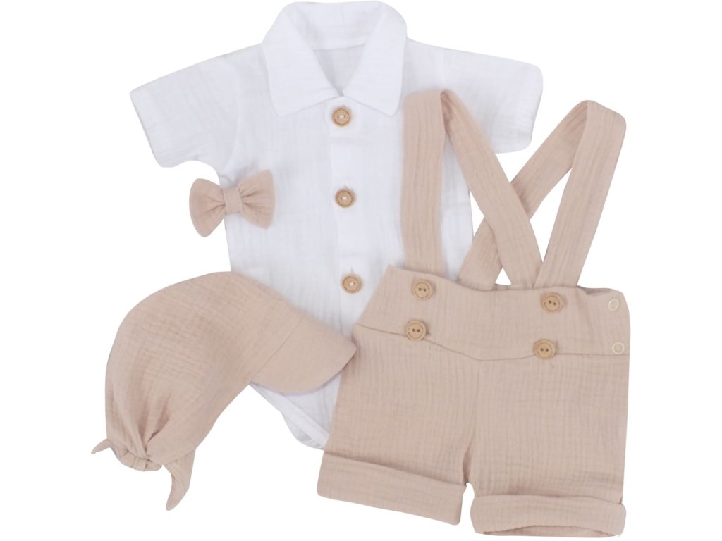 Mušelínové kraťasy s láclem, bodýčko, čepička, motýlek 4D sada, Z&Z, písková/bílá