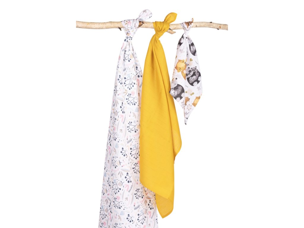 Tento set obsahuje 3 plienky v rôznych veľkostiach: 120×120 cm, 60×80 cm a 38×38 cm, +- 2cm, ktoré využijete pri zavinovaní, kŕmení aj hygiene.