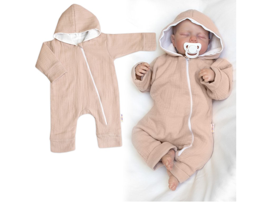 Mušelinový overálek s kapucí, dvouvrstvý, Hand Made, béžový