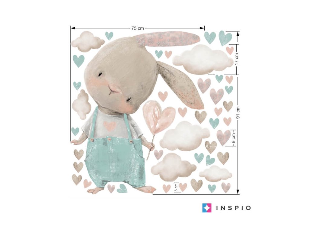 Nálepka na stenu - Akvarelový zajko s mentolovými srdiečkami