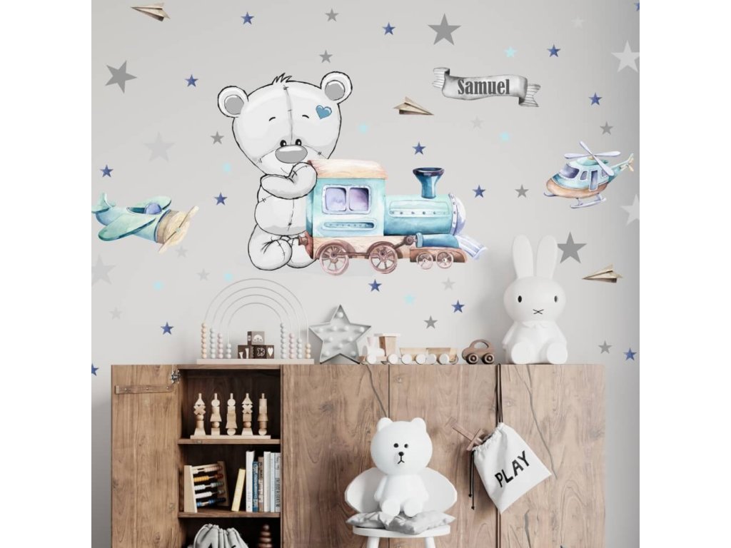 Prelepiteľná samolepka s menom pre chlapcov v rôznych farbách a variantoch. Obľúbený macík s vláčikom a doplnkami. S INSPIO plníme želania vašim deťom.