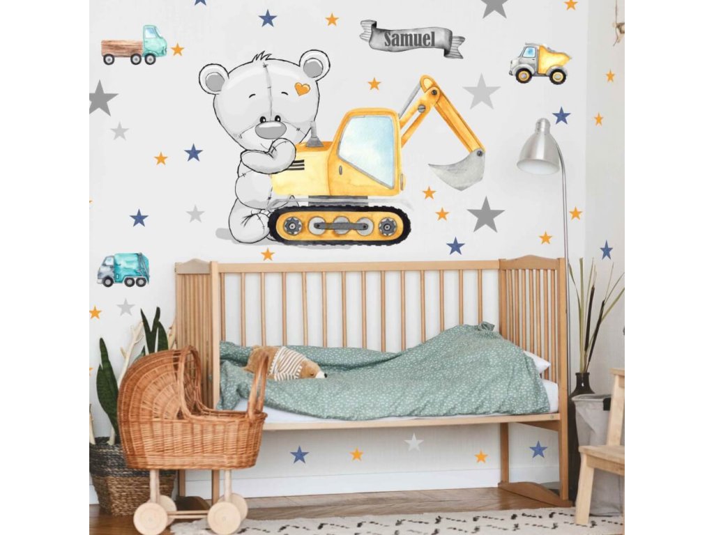 Textilná nálepka na stenu s menom a v rôznych farbách a variantoch. S INSPIO plníme želania vašim deťom. Obľúbený macík a stavebné stroje.
