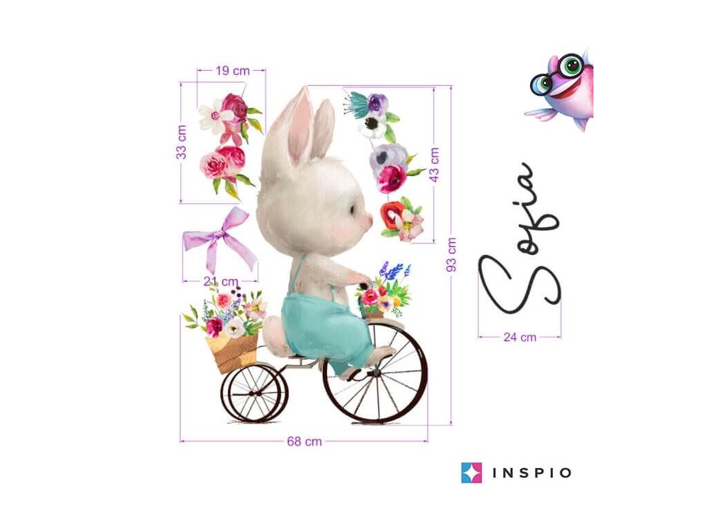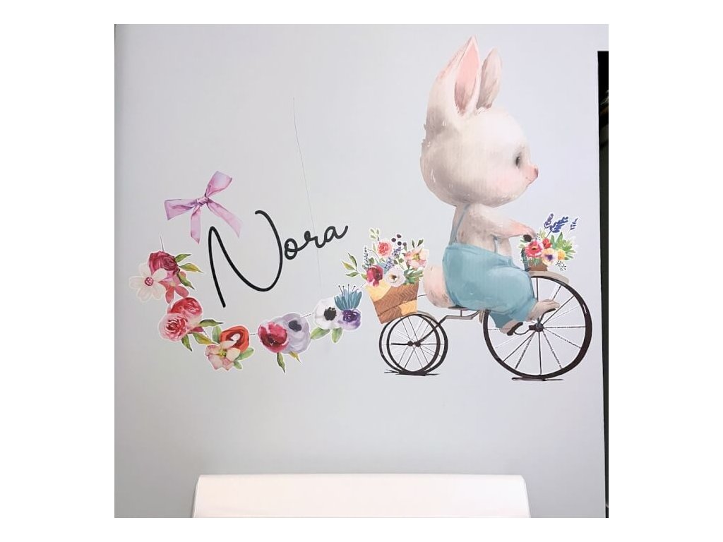 Hľadáte nálepku na stenu pre dievčatko? Nálepka s rozkošným zajačikom, krásnymi kvetmi a menom vašej dcérky je to pravé na stenu.