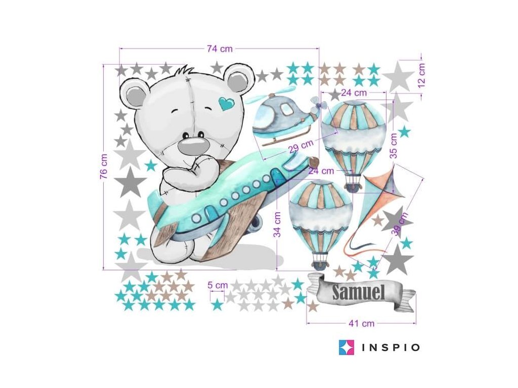 Textilná nálepka na stenu s menom do detskej izby v rôznych farbách a variantách. S INSPIO plníme želania vašim deťom. Obľúbený macík s lietadlom a balónmi
