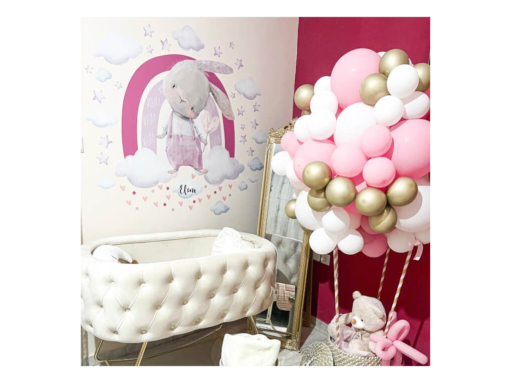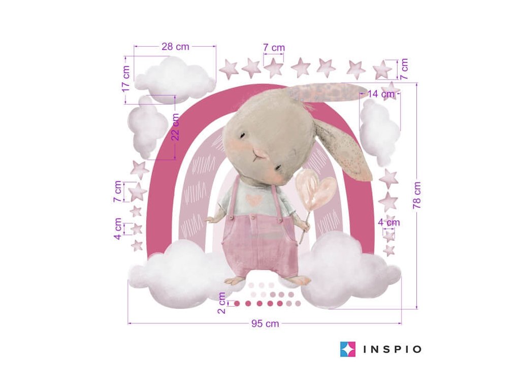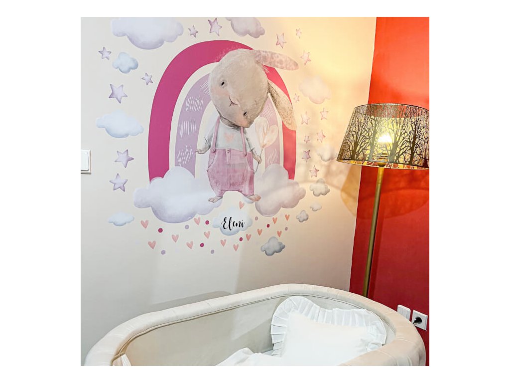 Hľadáte nálepku na stenu pre dievčatko? Pozrite si INSPIO nálepku s rozkošným ružovým zajačikom a dúhou. Textilná nálepka do detskej izby.