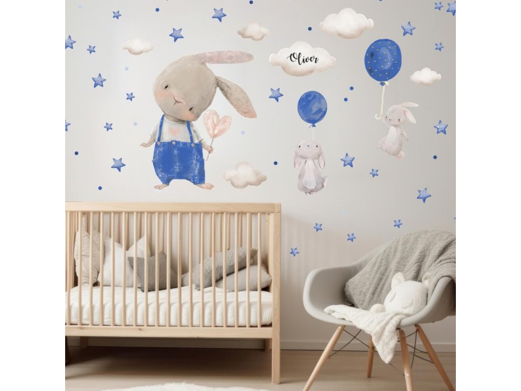 INSPIO nálepky pre detičky - roztomilé zajačiky v akvarelovom prevedení s balónmi, menom a hviezdičkami.