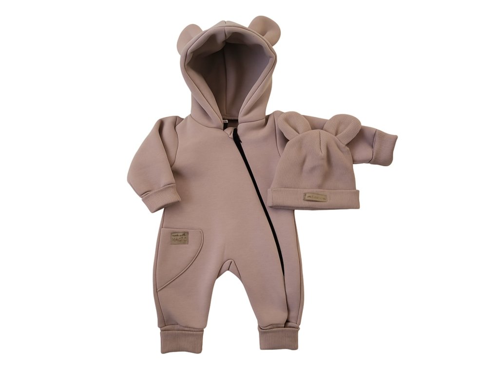 Oteplený detský overal bez šľapiek s kapucní + čiapočka, 2D, kakao