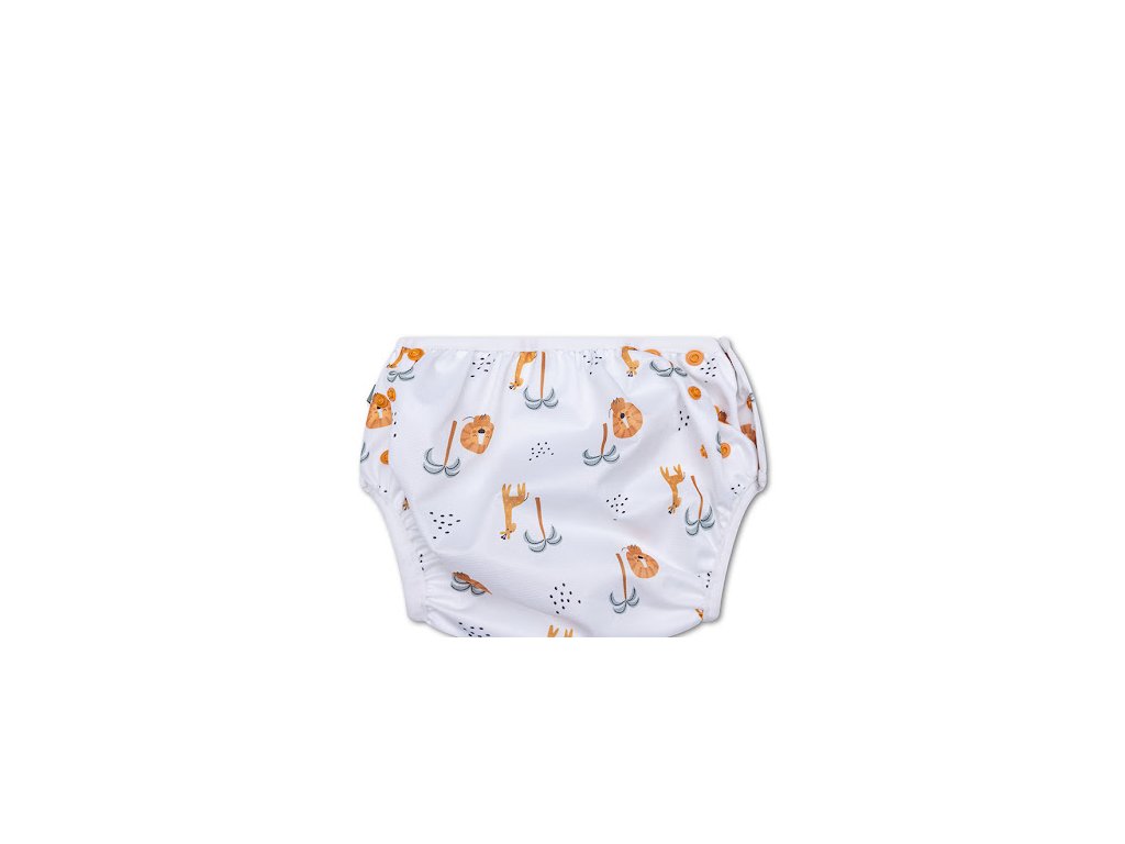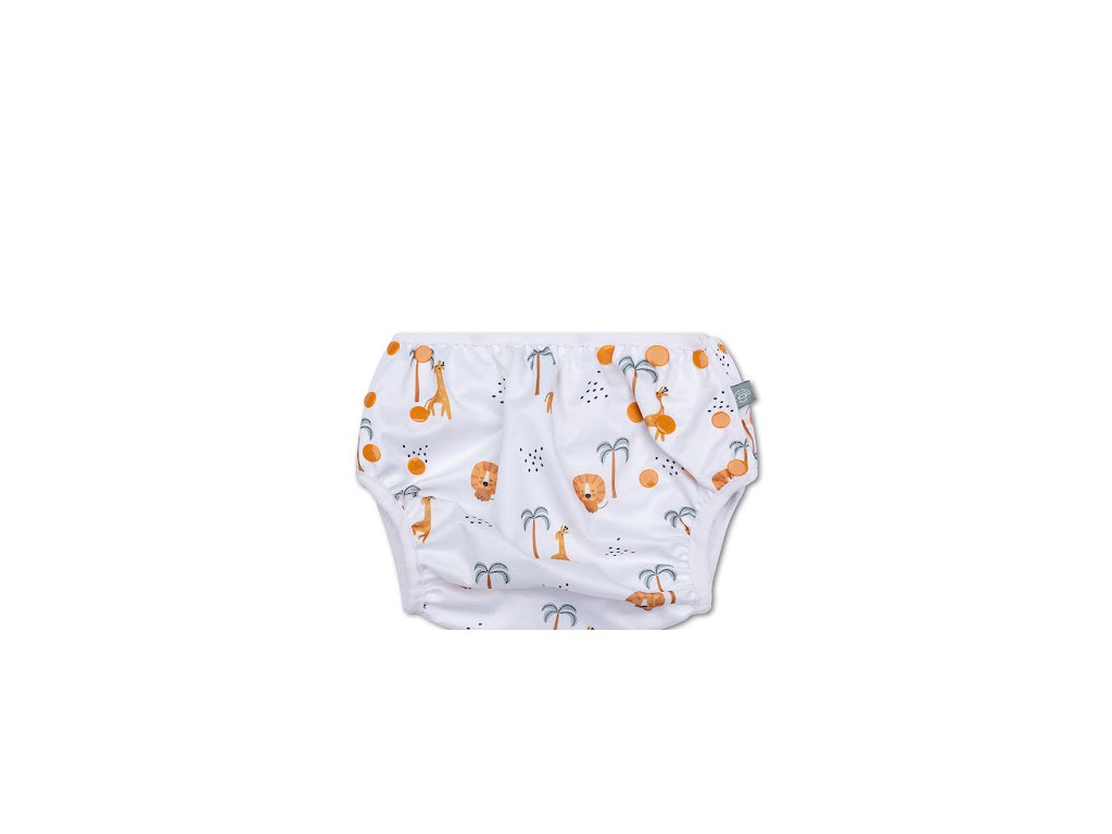 Plavky sú dobre umývateľné a nepriepustné pre prípad menšej nehody vo vode. Veľkosť sa dá upravovať podľa toho, ako vaše bábätko rastie. Plavky je možné kombinovať s klobúčikom s rovnakými motívmi a ďalšími výrobkami rovnakej značky.