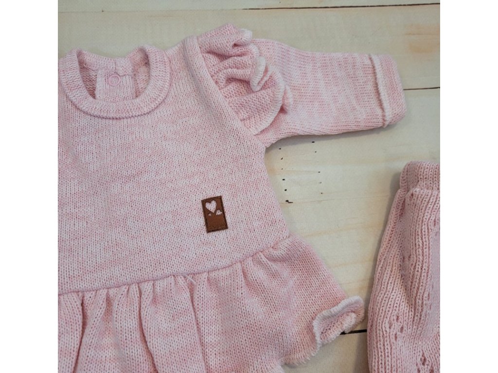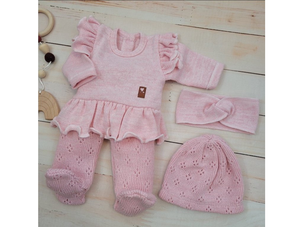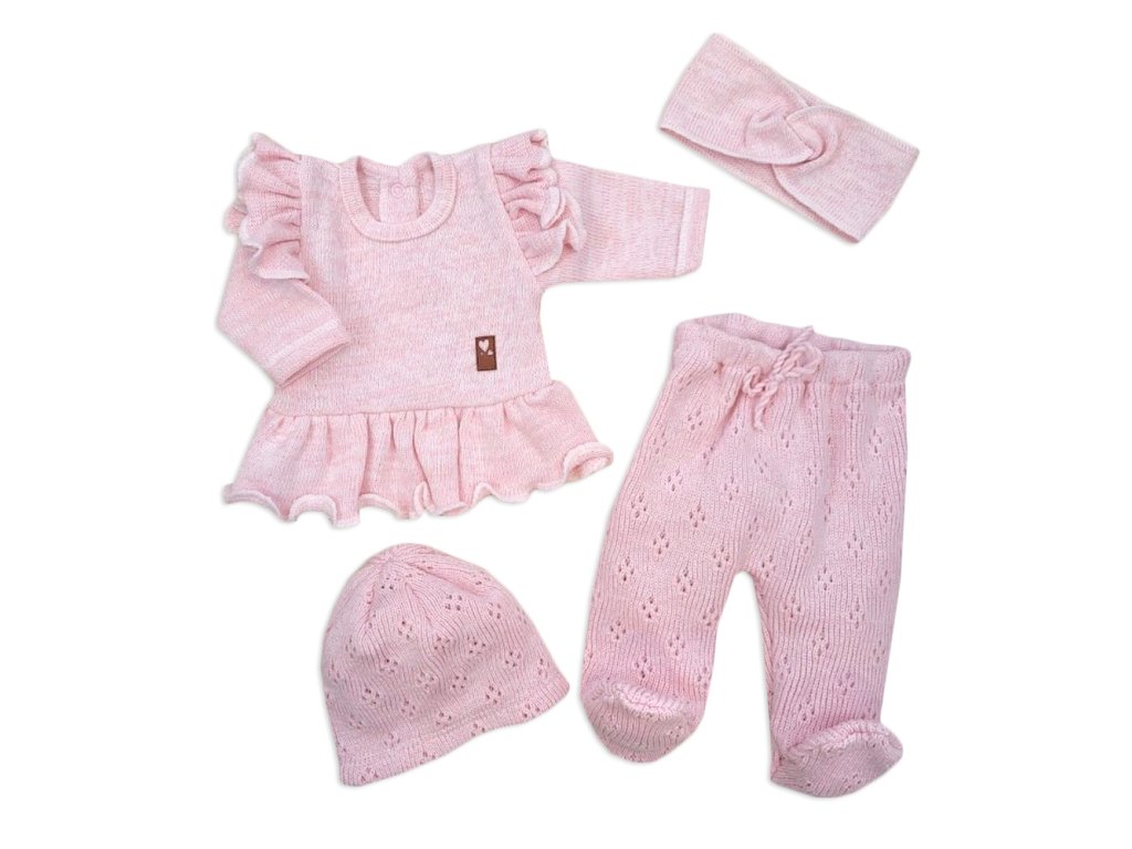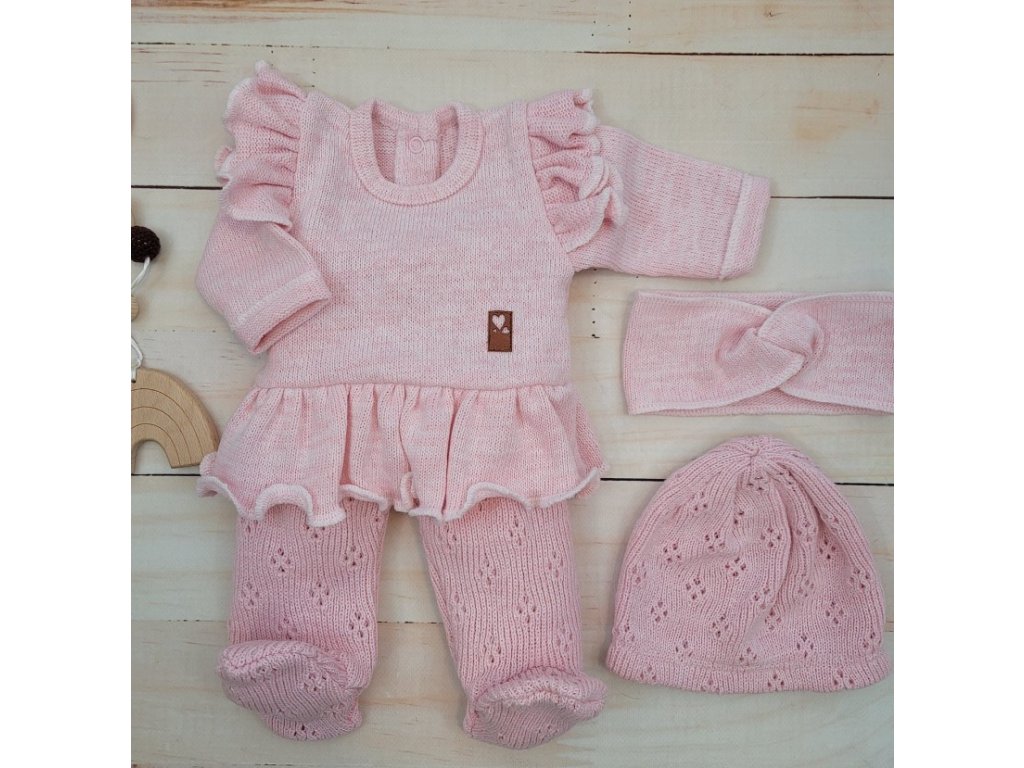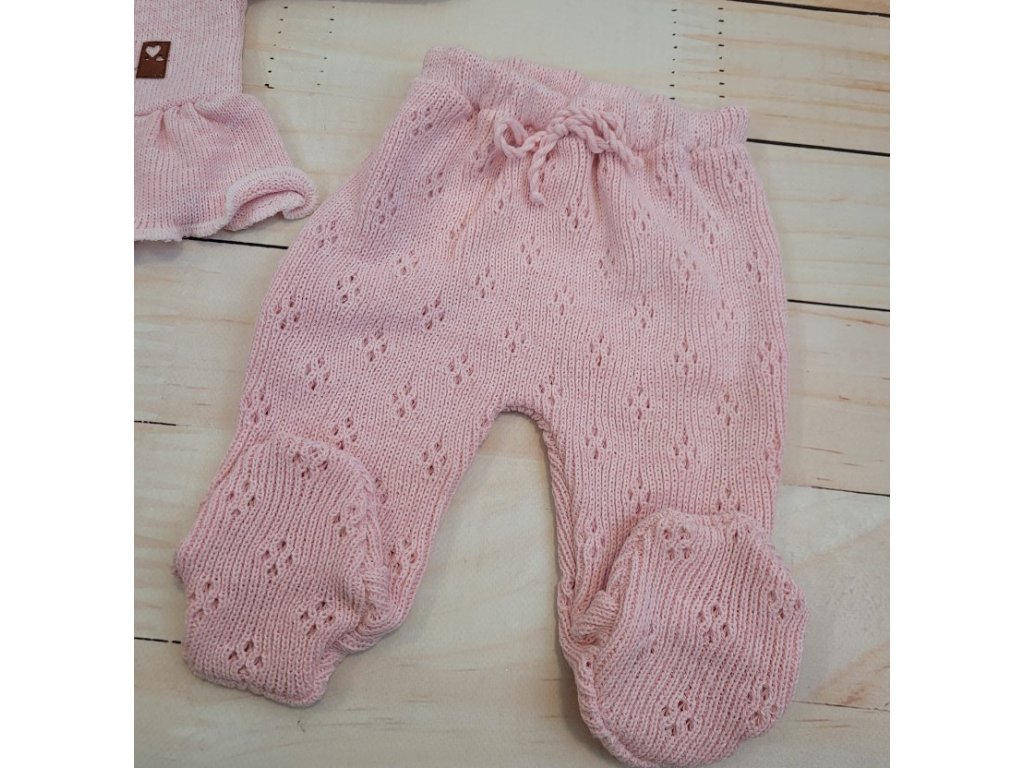 Pletená ažurková sada 4D, tunika, polodupačky, čepička + čelenka Kazum, růžová