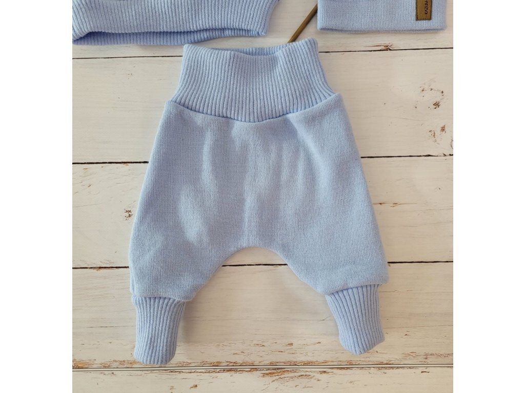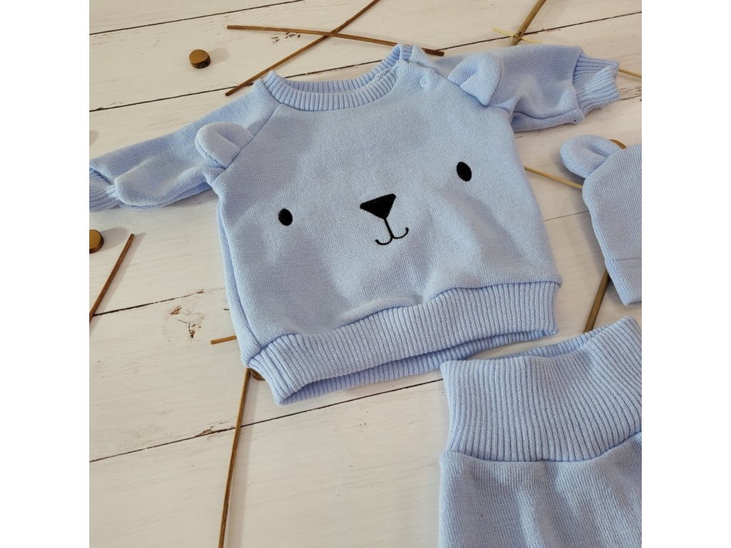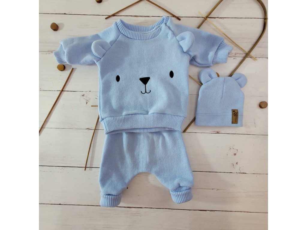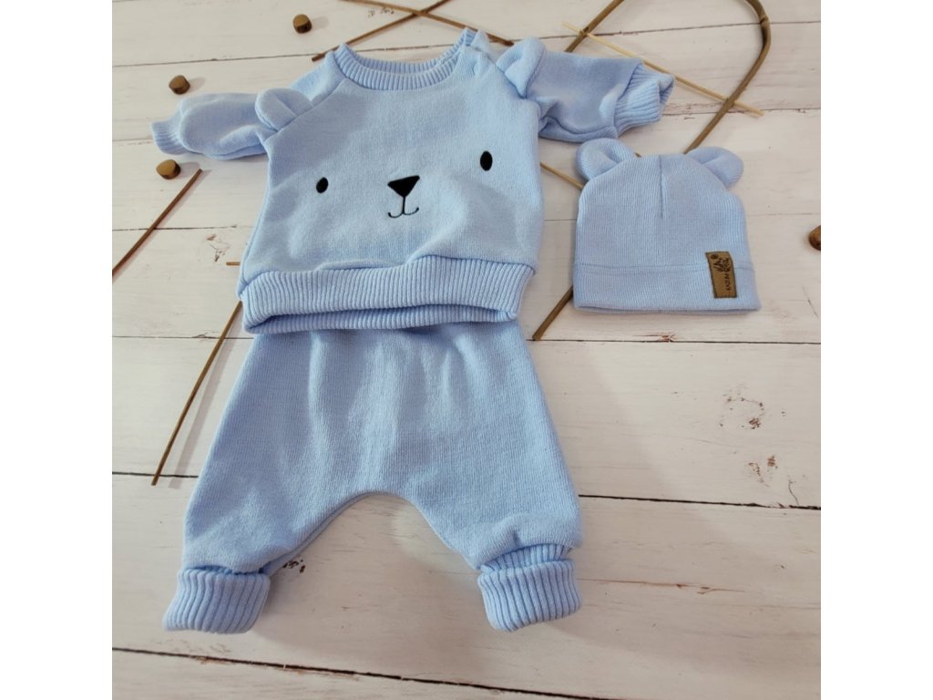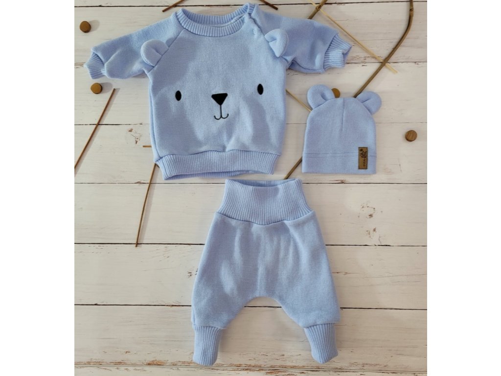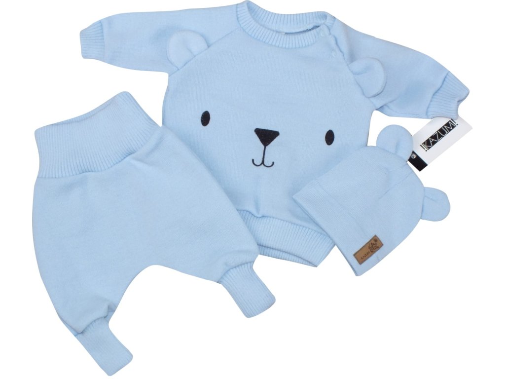 Pletená kojenecká sada 3D Medvídek, svetřík, tepláčky + čepička Kazum, modrá