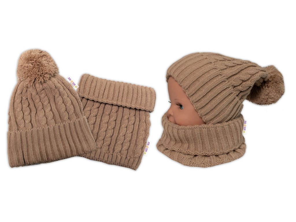 Pletená zimná čiapka s brmbolcom + komínček BABY NELLYS - bežová,veľ. 48-52cm