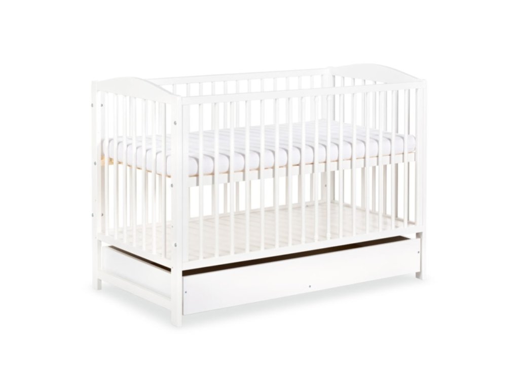 Detská postieľka so zásuvkou Inovatívny, moderný vzhľad. Veľmi príjemná univerzálna biela farba. Šuplík naspodku postieľky Rozmer 120x60cm Dno postieľky je možné nastaviť do troch polôh podľa veku dieťaťa. Matrac nie je súčasťou.