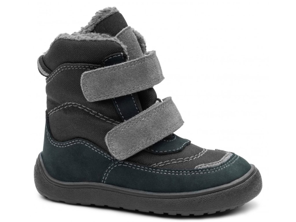 Chlapčenské zimné barefoot topánky sú vyrobené v kombinácii brúsenej kože a textílie v čiernej farbe, doplnené o sivé pásiky.
