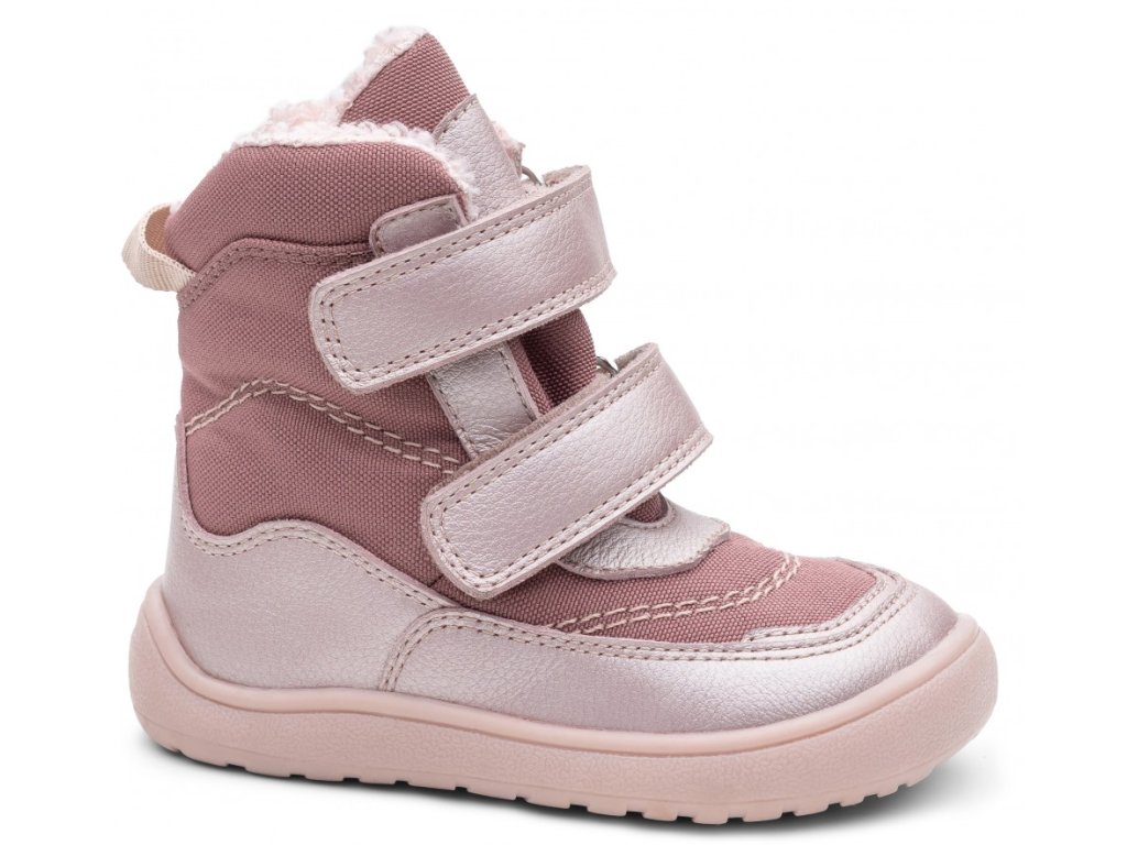 Dievčenské barefoot zimné topánky sú vyrobené z hladkej, umývateľnej kože a textílie v staroružovej farbe s perleťovým efektom.Topánky sú vyššieho strihu. Membrána PROTEX účinne chráni nohy pred dažďom a vlhkosťou. Dva suché zipsy pevne fixujú topánku na nohe. Vo vnútri sa nachádza netvarovaná, vyberateľná flísová stielka a mäkká kožušinka pre ešte väčší komfort.