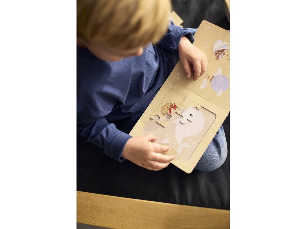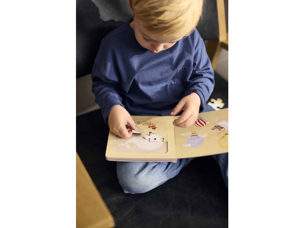 Táto starostlivo spracovaná knižka s hrubými, odolnými stranami obsahuje štyri pútavé puzzle, každé s 9 robustnými dielikmi, ktoré sa malým ručičkám ľahko uchopujú. Kompaktný formát (17 × 17 cm) je ideálny na cestovanie aj pokojné hranie doma a vďaka umývateľnému povrchu je knižka vždy pripravená na ďalšie dobrodružstvo. Vhodná pre deti od 3 rokov, podporuje rozvoj jemnej motoriky, sústredenia a riešenia problémov.