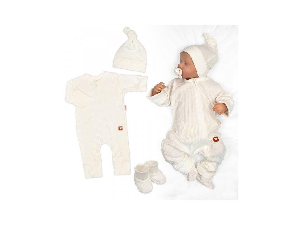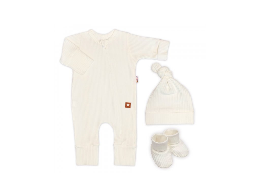 Rastúci rebrovaný overálek, čiapočka a topánočky, 3D, Nature - ecru