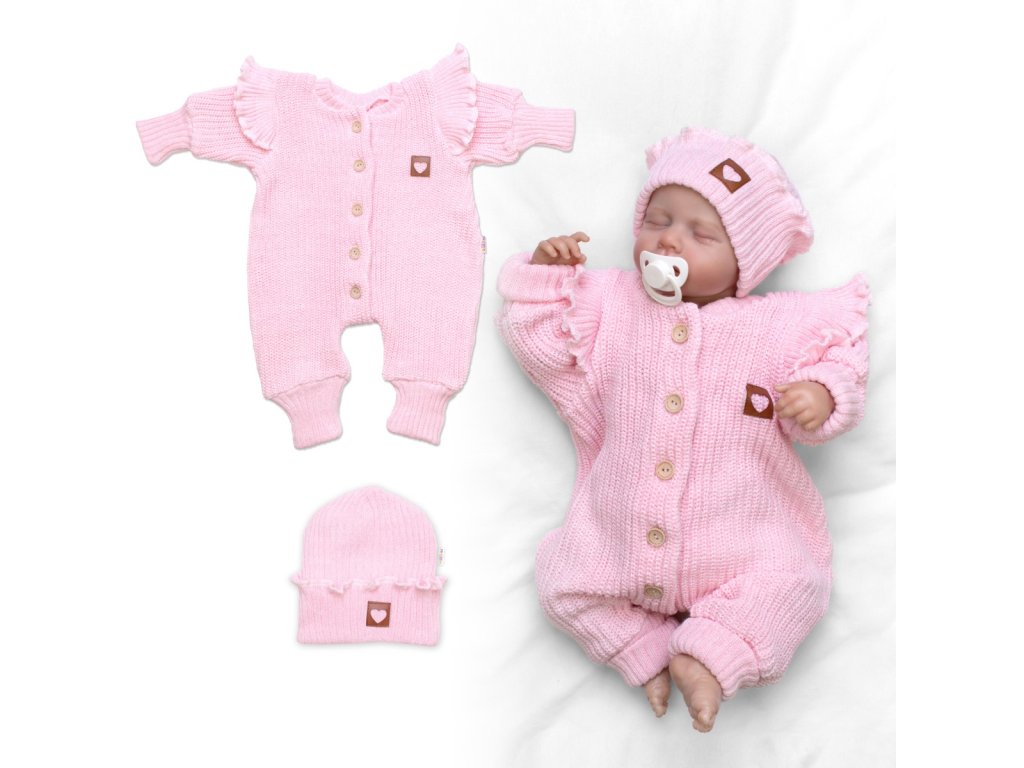 Rostoucí pletený oversize overálek + čepička Love s volánkem, růžový