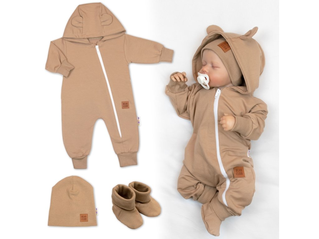 Rostoucí teplákový overal pro miminko, čepice, botky, 3D, Nature - karamelová