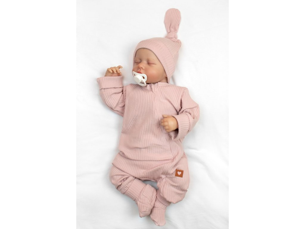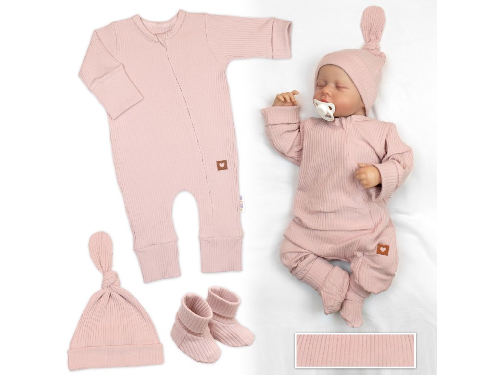 Rostoucí žebrovaný overálek, čepička a botičky, 3D, Nature - pudrově růžová