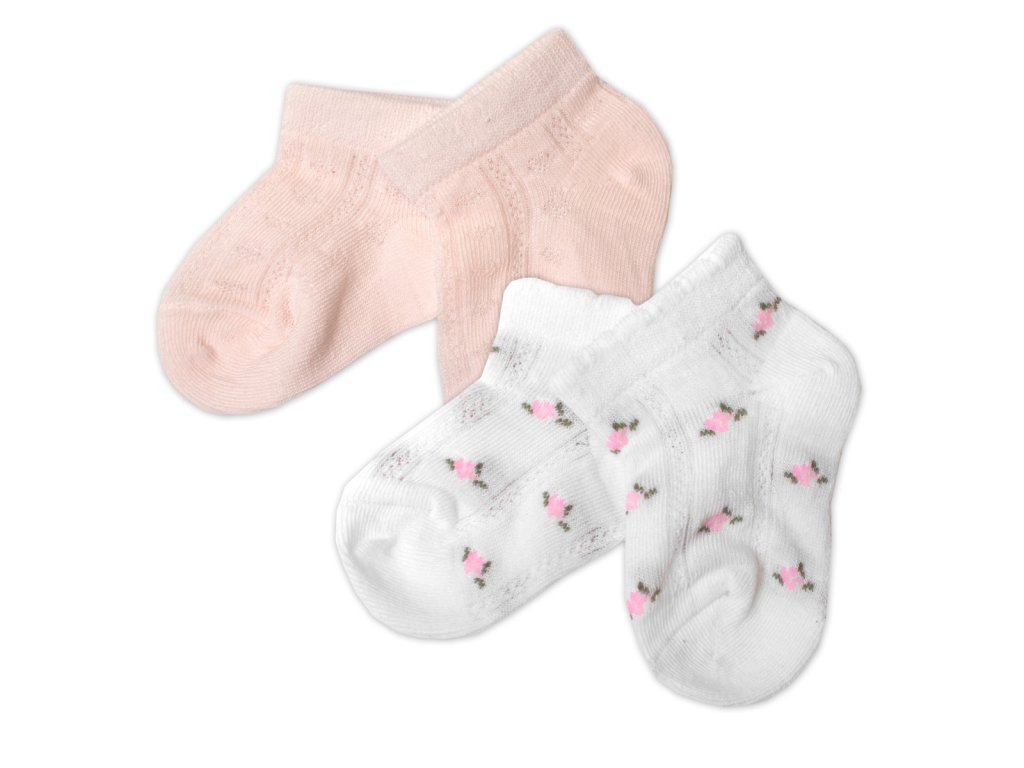Sada obsahuje 2 páry ponožek - 1x růžové, 1x bílé s kytičkama.