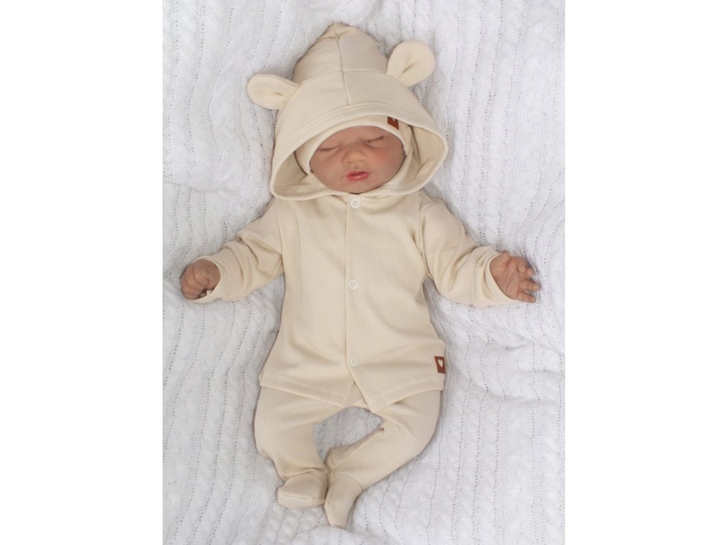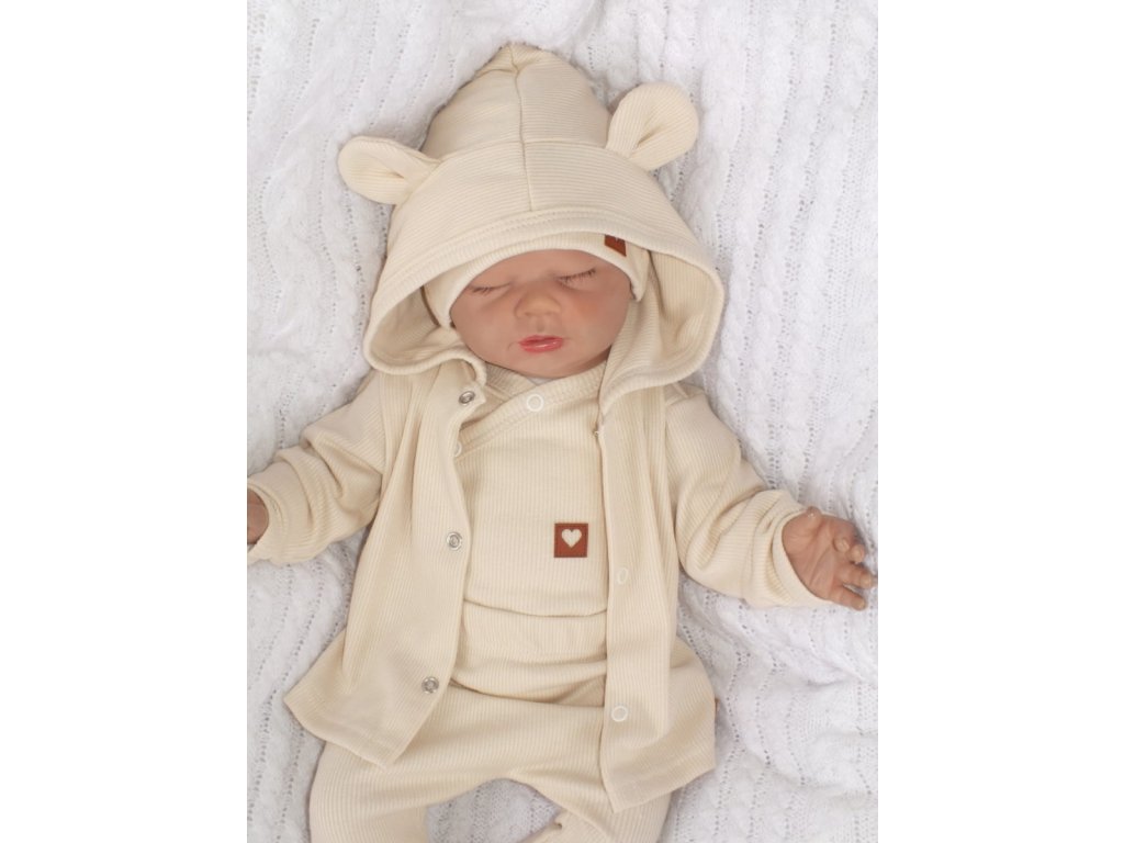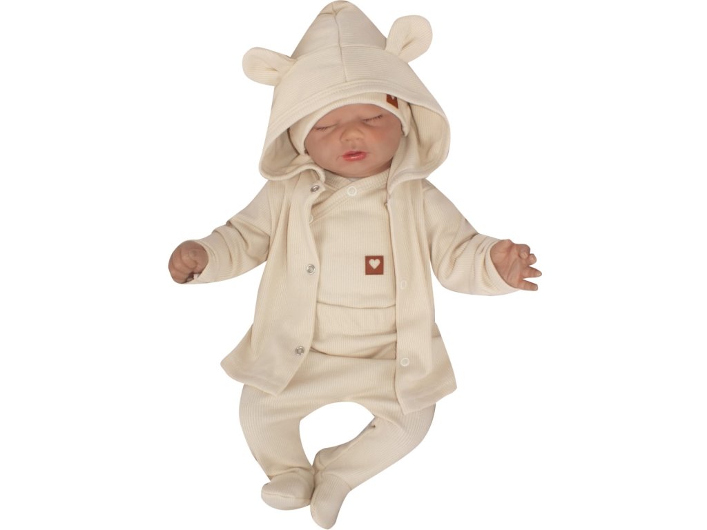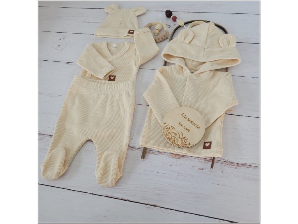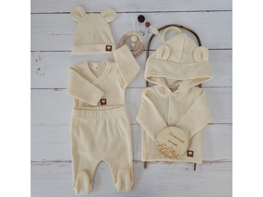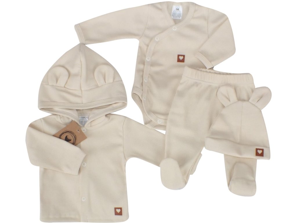 Sada do porodnice 4D, žebrovaná, body, polodupačky, kabátek a čepička, ecru