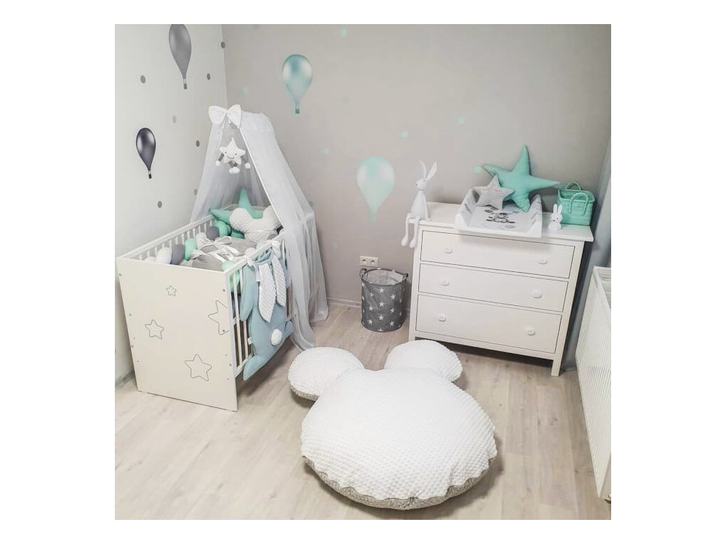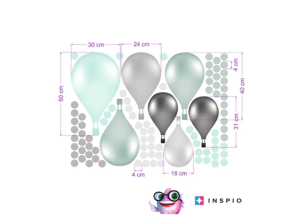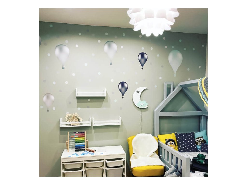 Samolepiace balóny na stenu v mentolovej a sivej farbe z textilnej fólie, ktorá je umývateľná, pevná a vhodná aj na drsnú omietku.
