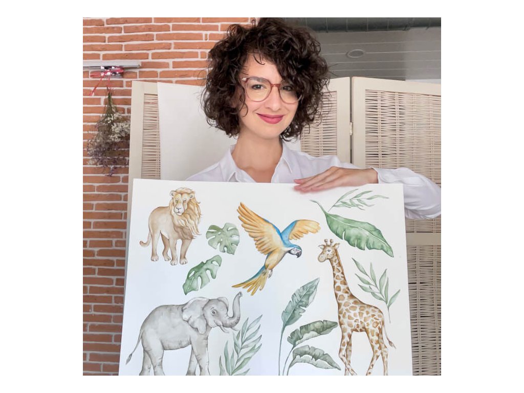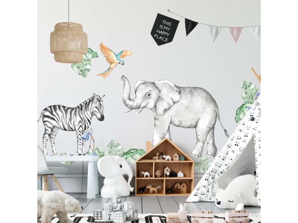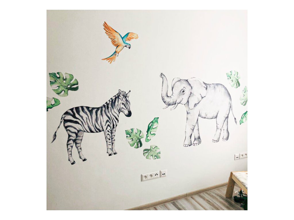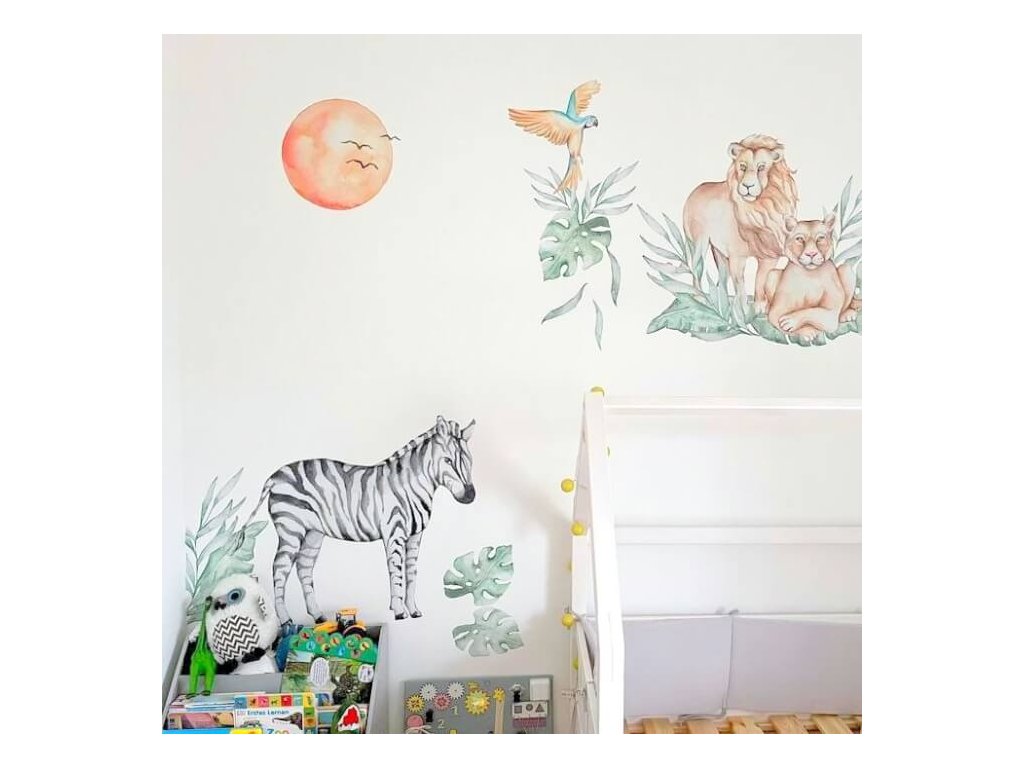 Ručne maľované akvarelové SAFARI samolepky na stenu vyzerajú po nalepení ako umelecké dielo.