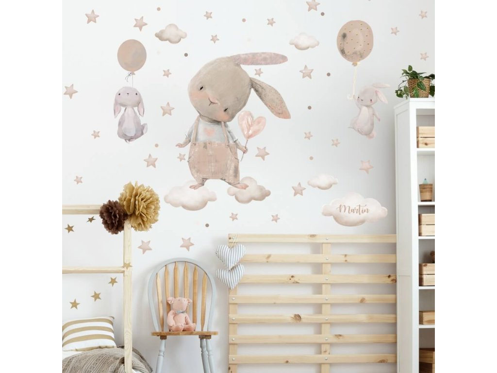 Samolepky pre deti - Zajkovia s hviezdičkami, balónmi a menom