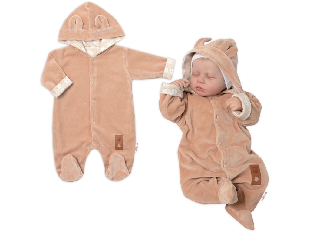 Dvouvrstvý teplejší velurový overálek podšitý bavlněnou látkou se stylovou kapucí ozdobenou ušima. Celorozpínací na cvočky, což umožňuje snadné převlékaní a přebalovaní.