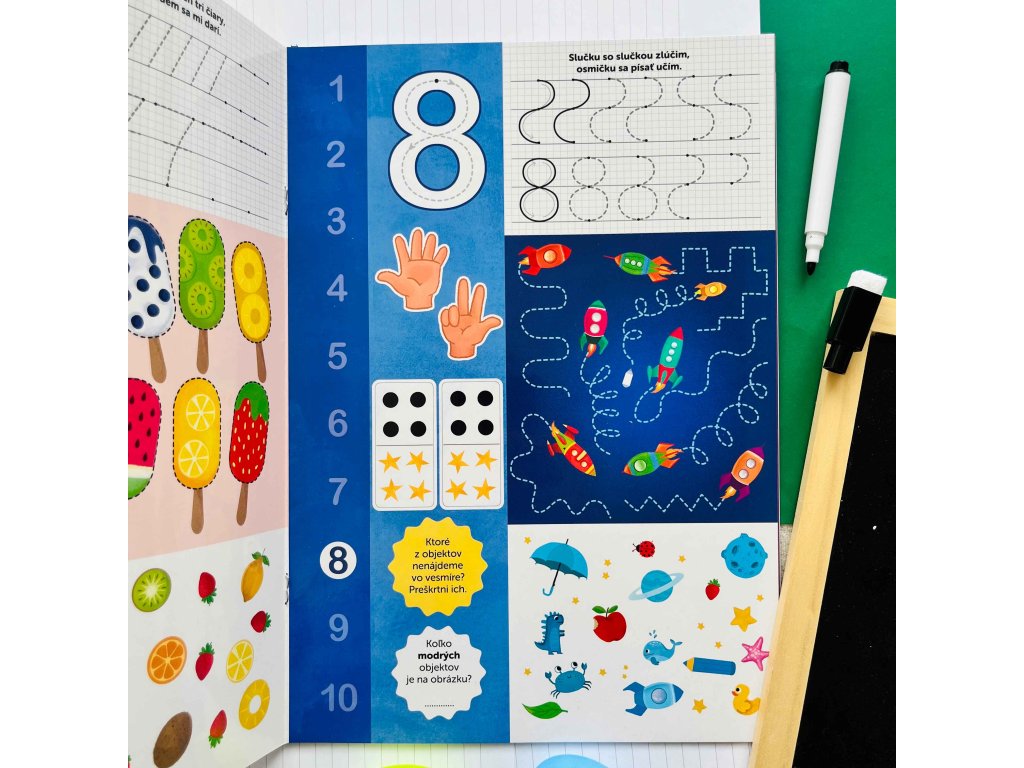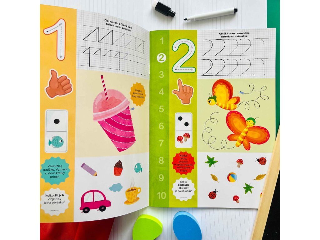 Pracovný zošit Skús to znova! – Čísla a farby naučí malých zvedavcov rozpoznávať základné farby a písať číslice od jeden do desať. Nápovedu im poskytnú prerušované čiary.