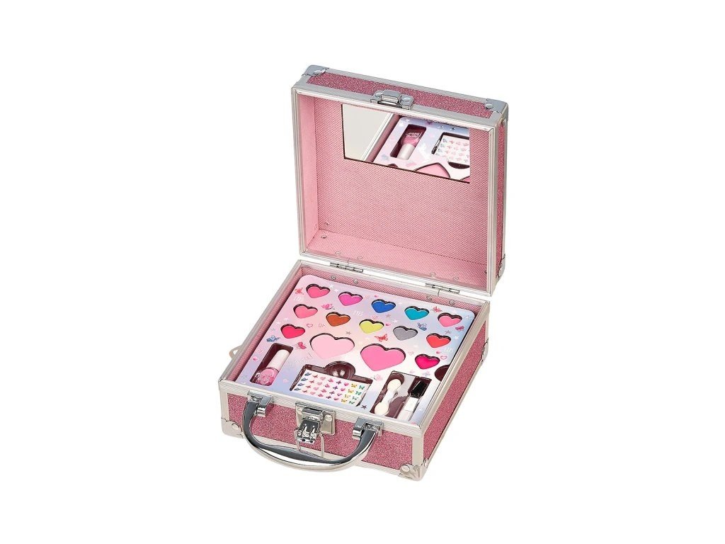 Detská mejkap súprava v kufríku so zrkadielkom je perfektný darček pre malé milovníčky líčenia od 6 rokov. Súprava obsahuje ružový lak na nechty, 6 krémových rúžov, 6 očných tieňov v krásnych farbách, 2 lícenky a hárok malých samolepiek na nechty, dva aplikátory (jeden s hubkou a jeden s jemným štetcom). Kozmetika je dermatologicky testovaná, úplne bezpečná a nedráždivá. Ľahko sa zmýva teplou mydlovou vodou. Laky na nechty sú úplne bezpečné a nedráždivé. Na nechtoch vytvárajú zlupovaciu vrstvu, vďaka čomu sa ľahko odstraňujú (rovnako ako samolepky). Ideálna súprava na večierky, narodeniny, hranie na fantasy alebo ako štýlový darček.
