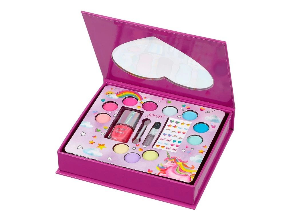 Kozmetická súprava na líčenie pre deti od 6 rokov. Súprava obsahuje: ružový zlupovací lak na nechty, 11 farebných očných tieňov, hárok malých samolepiek na nechty, aplikátor s dvojitou hubkou a mäkký štetec. Kozmetika je 100 % vegánska a netestovaná na zvieratách. Lak sa ľahko zlúpne z nechtu ako samolepka, nie je potrebný odlakovač. Očné tiene sa jednoducho zmývajú teplou vodou a mydlom. Všetko je uložené v peknej kartónovej škatuľke s priehľadným okienkom v tvare koruny. Ideálny ako darček na narodeniny.