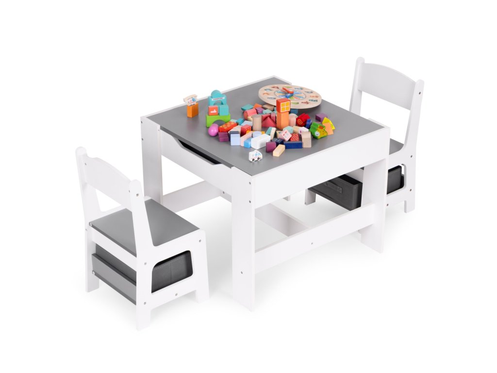 Komplet tvorí stolík s obojstrannou doskou a dve detské stoličky, ktoré majú pod sedadlom textilnú zásuvku.