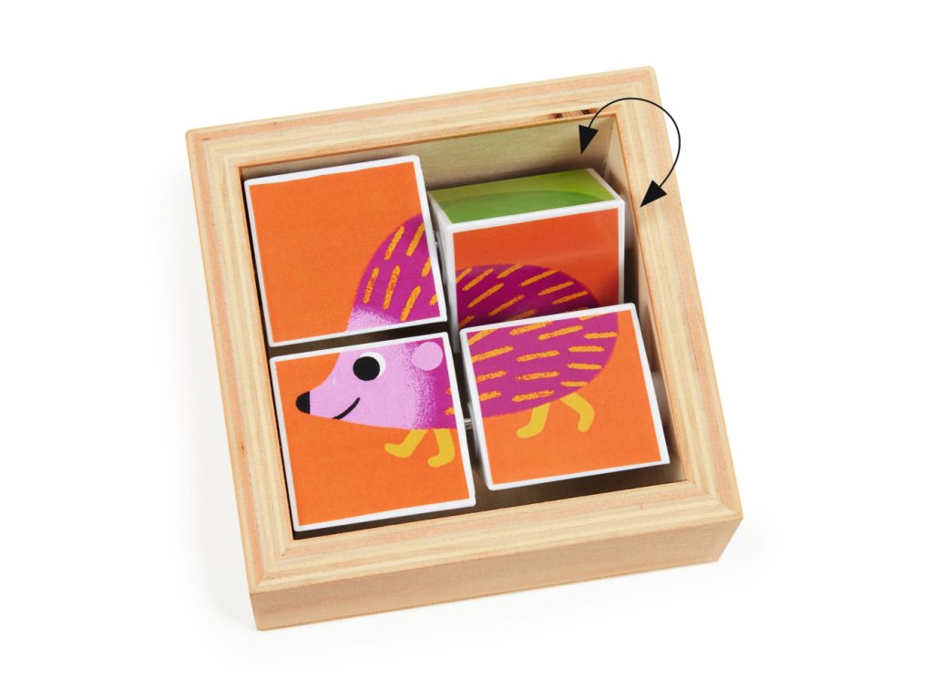 Pretáčacie puzzle pre batoľatá. Obsahuje 4 ilustrované pyramídové plastové diely v drevenom ráme. Tieto diely sa z rámu nevyberajú, sú v ňom nastrčené na kovové tyčky. Dieťa skladá obrázky pretáčaním strán dielov. Poskladať sa dajú 3 obrázky zvieratiek: ježko, korytnačka a miška. Diely tohto puzzle sa zaručene nestratia.