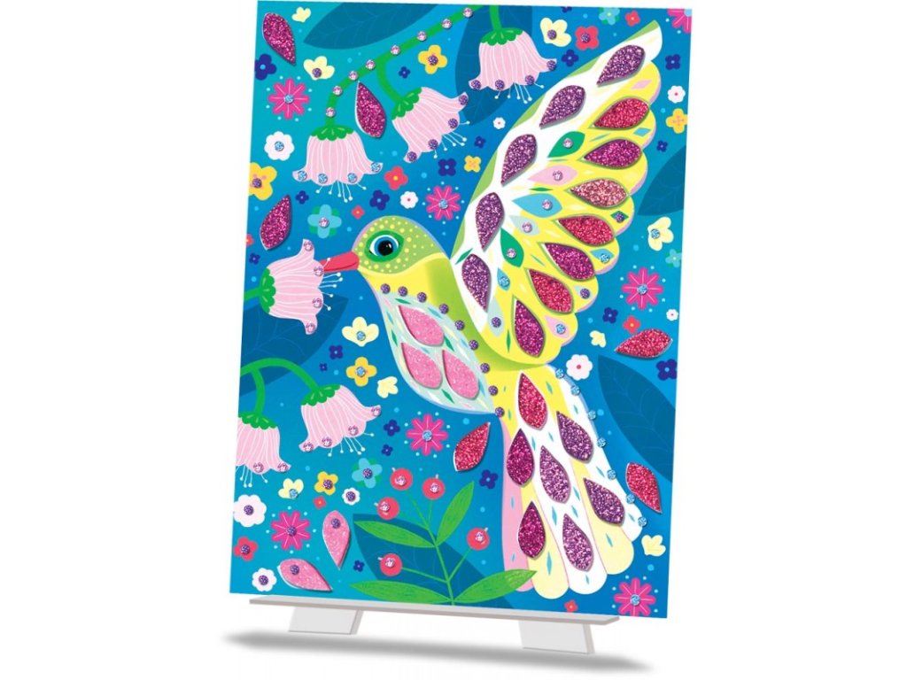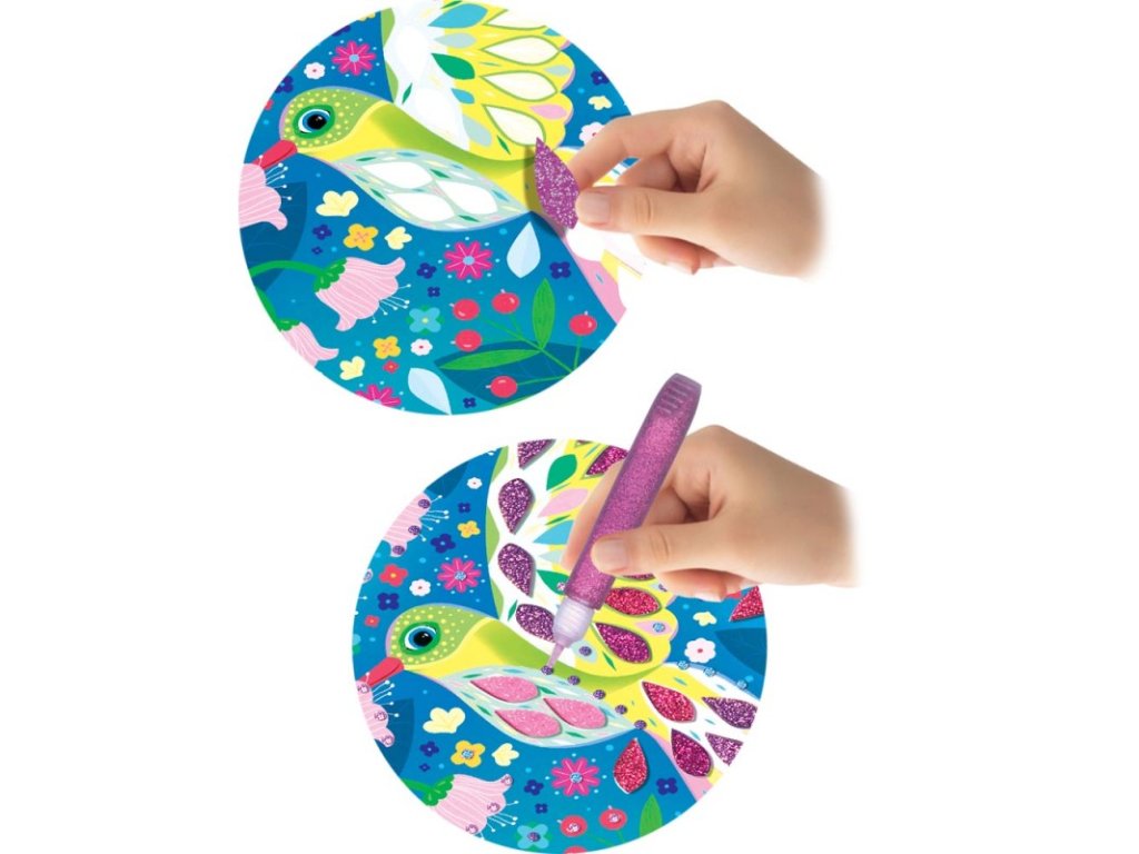Trblietavá mozaika Vtáky 5+ Vytvor si trblietavé vtáčiky! Jedinečná kreatívna súprava pre deti s trblietavými nálepkami a trblietkami od francúzskej značky Crea Lign je vhodná pre deti od 5 rokov. Obsahuje 6 obrázkov pestrofarebných vtákov, 5 hárkov s farebnými a rôzne tvarovanými trblietavými nálepkami a 3 tuby s trblietkami. Vďaka nim si deti nádherné vtáky krásne dotvoria. V baleniach nechýba tiež 1 skladací stojan na vystavenie trblietavej mozaiky.S Crea Lign sa deti učia nové umelecké techniky Tvorenie s trblietkami a samolepkami podporuje rozvoj jemnej motoriky, predstavivosti i kreativity. Produkt je vysoko kvalitný a bezpečný, rovnako ako všetky ostatné výrobky francúzskej značky Crea Lign. Jej cieľom je vyvíjať kreatívne potreby a hry, ktoré podporujú rozvoj detí a umožňujú každému z nich nájsť to, čo ho baví.