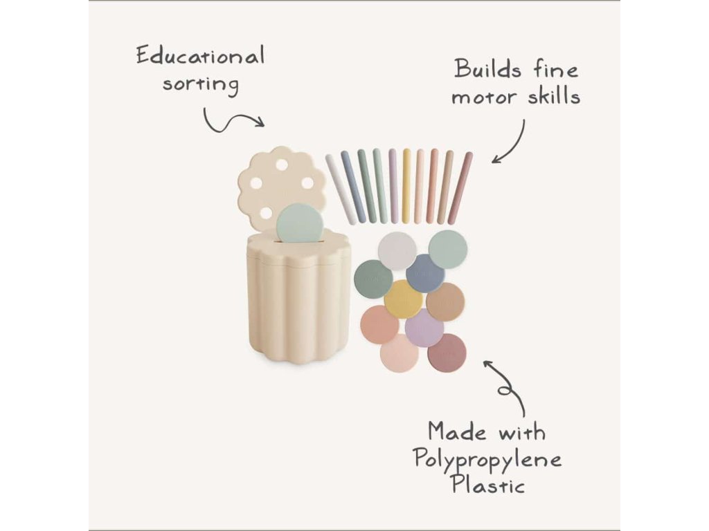 Súprava obsahuje 20 farebných mincí a trubičiek, pomocou ktorých si deti precvičujú vkladanie jednotlivých dielikov do zodpovedajúcich otvorov – čím si rozvíjajú jemnú motoriku a koordináciu ruka-oko. Či už sa učia triediť alebo priraďovať, táto všestranná a zábavná hračka poskytne batoľatám hodiny vzdelávacej zábavy.