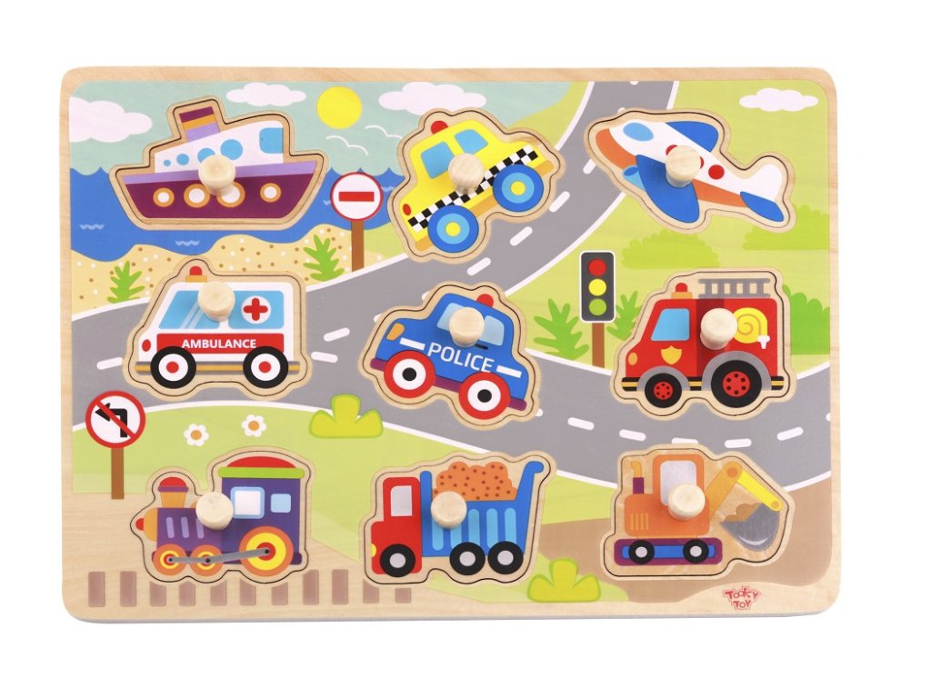 Vkladacie puzzle Dopravné prostriedky Deti sa stanú súčasťou dopravnej prevádzky. Tematické puzzle obsahuje podkladovú dosku a 9 drevených dopravných prostriedkov, napríklad policajné auto, lietadlo či bager. Je odolné, vyrobené z udržateľného dreva, ručne natreté farbami na vodnej báze a fixované lepidlom bez formaldehydu.Vkladacie puzzle rozvíja jemnú motoriku Zlepšuje tiež koordináciu oko-ruka, trpezlivosť a schopnosť samostatne sa hrať. Vďaka veľkým dielokom s úchytkami je vhodné už pre deti od 18 mesiacov.