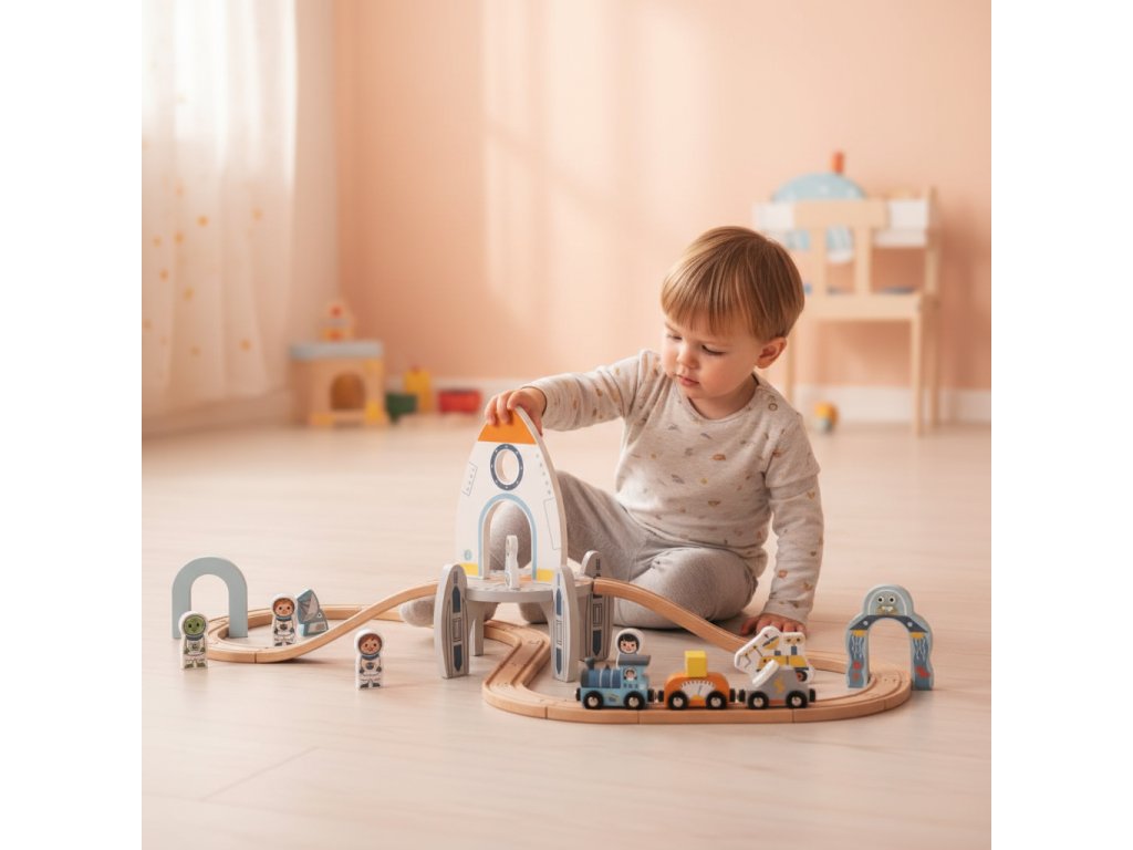 Vláčiková dráha VesmírGalaktické dobrodružstvo na koľajniciach — vláčiková dráha plná vesmírnych tajomstievPresuňte hranie do vesmíru: s touto drevenou súpravou si deti postavia vlastnú vesmírnu trať, po ktorej jazdí malý vláčik medzi raketou, UFO a astronautom. Táto hračka od značky Tooky Toy podporuje tvorivosť, koordináciu ruka–oko a umožňuje vytvoriť mnoho príbehov o dobrodružstve.Malé detaily, ktoré robia veľký rozdielSúprava obsahuje drevené koľaje, vláčik s dvomi vagónikmi, postavy astronautov a motívy ako UFO či raketa — vstupenku do sveta mimo Zeme. Viacúrovňová dráha dodáva hre dynamiku a umožňuje variabilné stavanie — v každom momente môže byť trať iná. Materiál: kvalitné drevo + bezpečné farby, ideálne pre deti od približne 2 rokov.