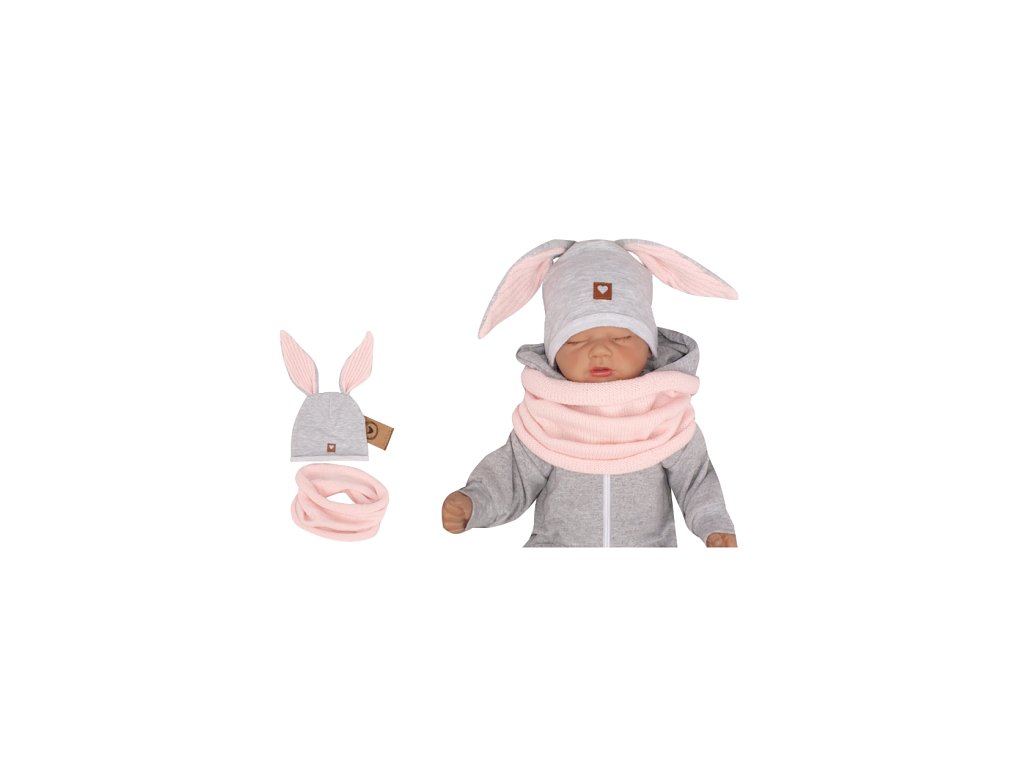 Z&Z Kojenecká bavlněná čepička Zajíček s nákrčníkem, šedá/růžová