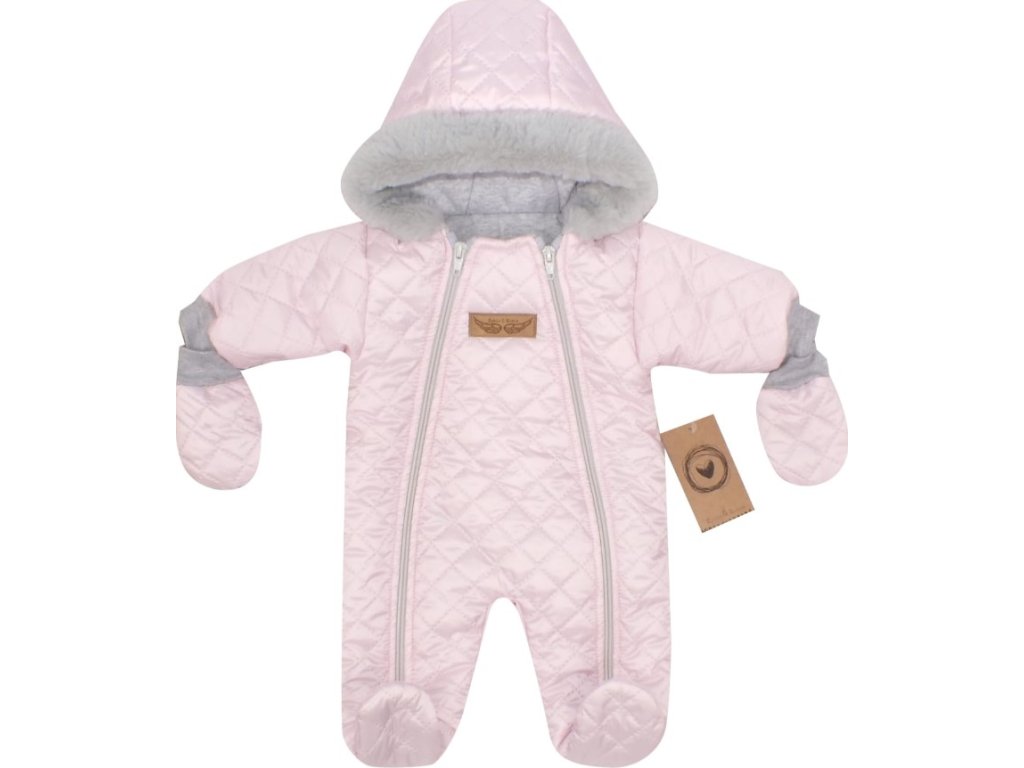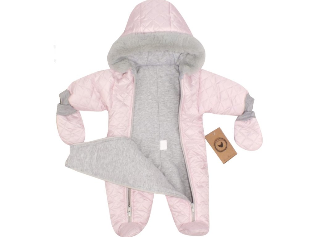 Z&Z Zimní prošívaná kombinéza s kožešinou a kapucí + rukavičky - sv.růžová
