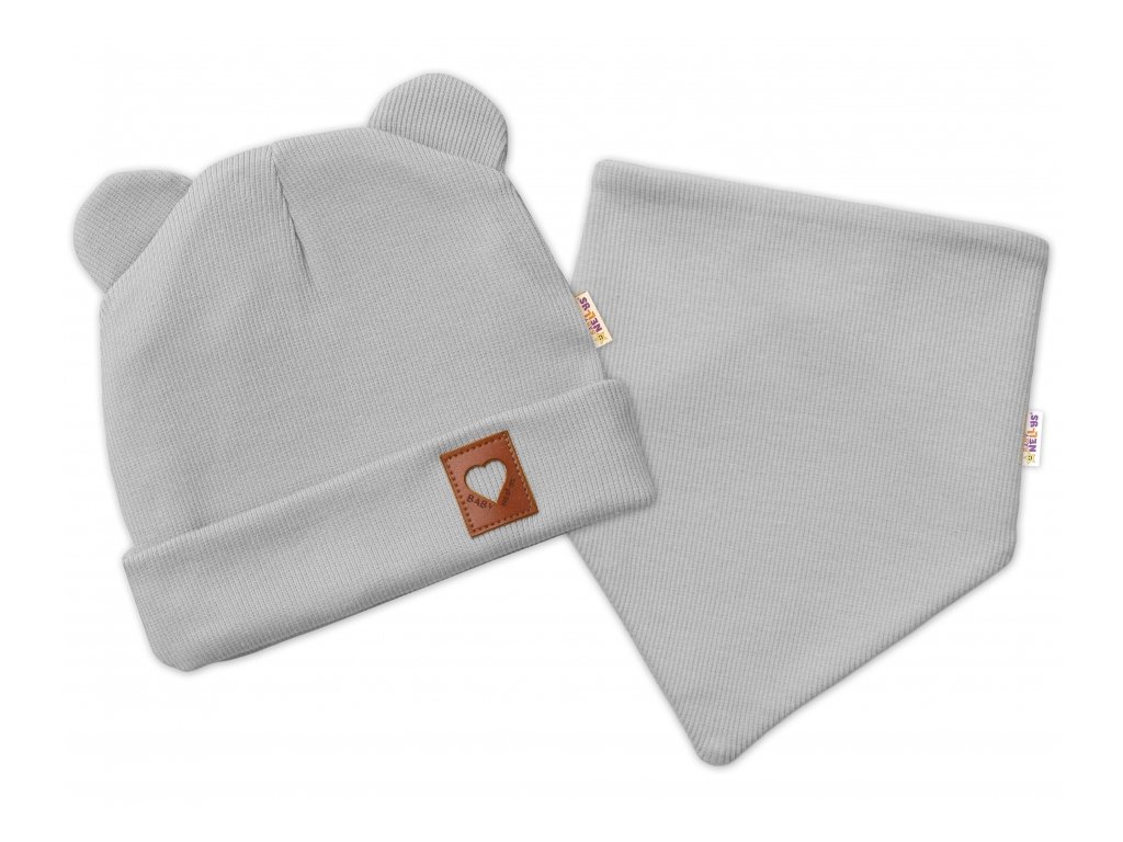 Žebrovaná dvouvrstvá čepice s oušky + šátek TEDDY - šedá