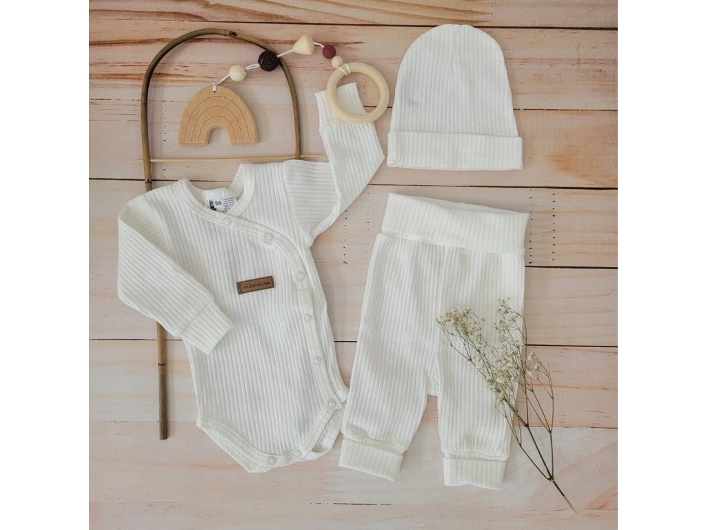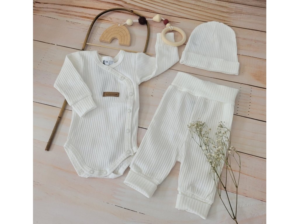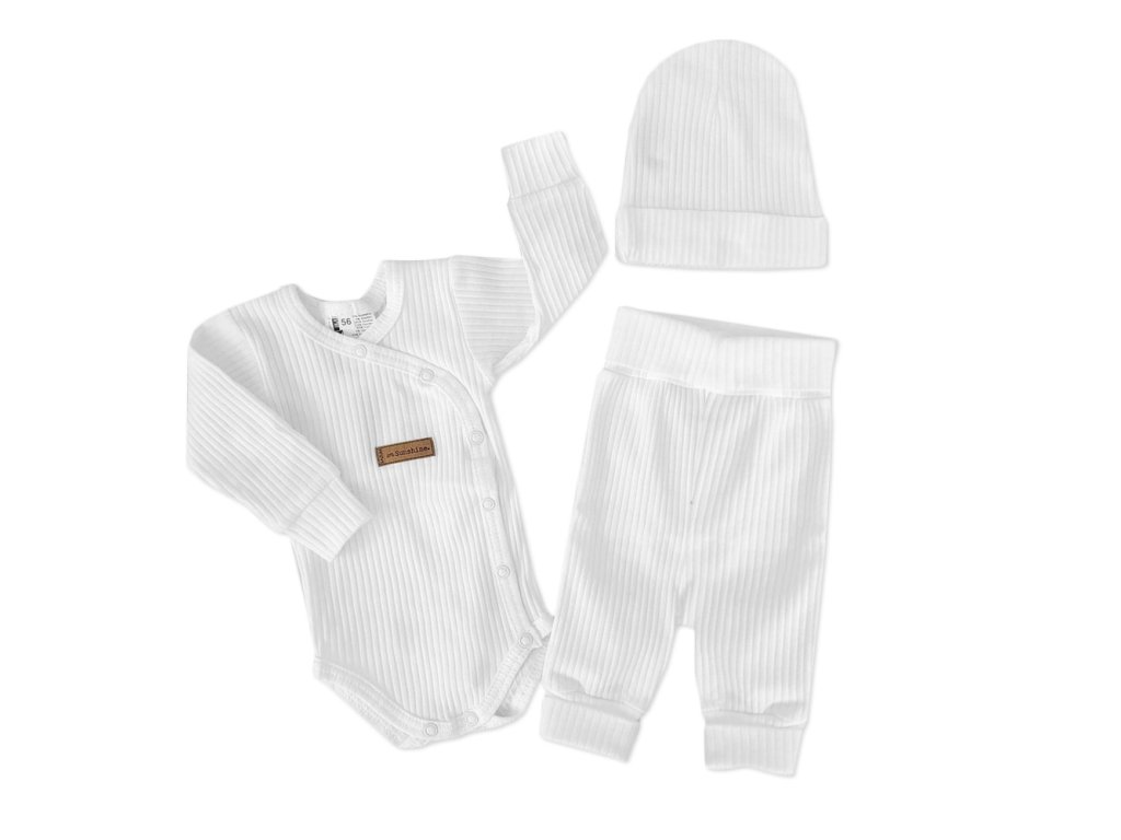 Žebrované zavinovací body, tepláčky a čepička Kazum 3D bavlněná sada, bílé