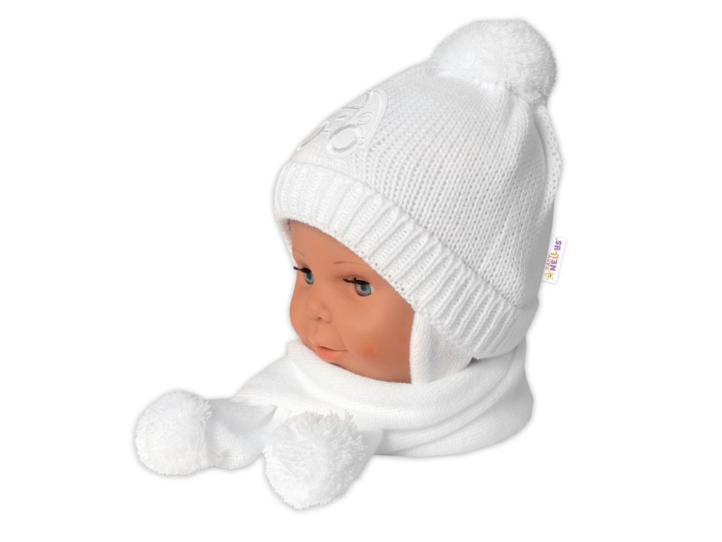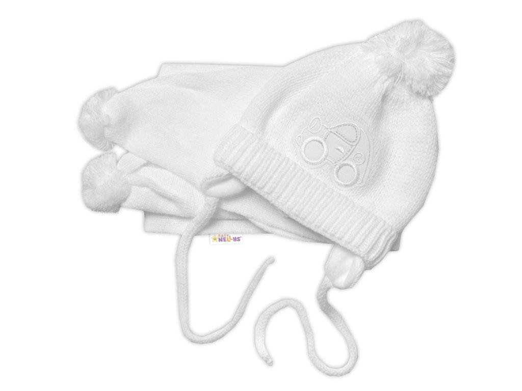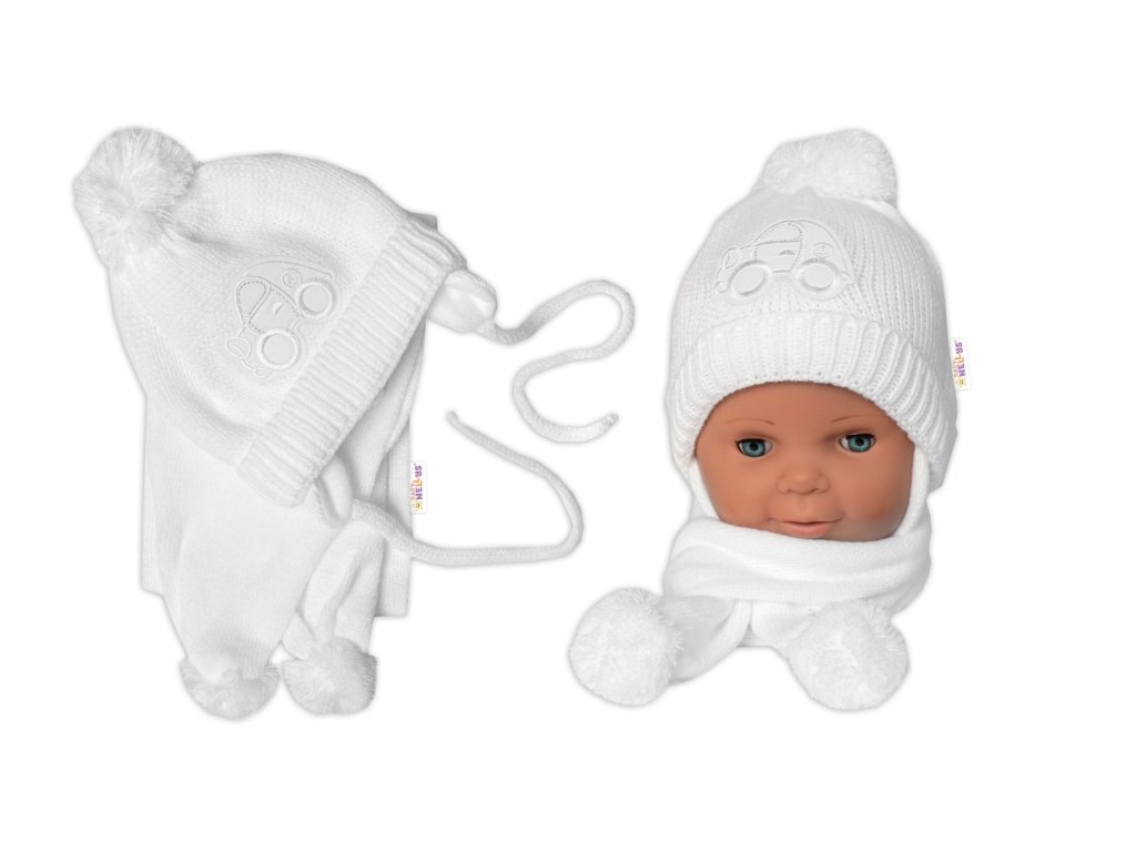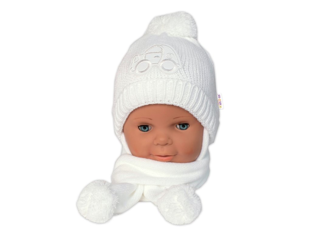 Zimná čiapočka s šálom - Autíčko, biela, 0-6m, Baby Nellys