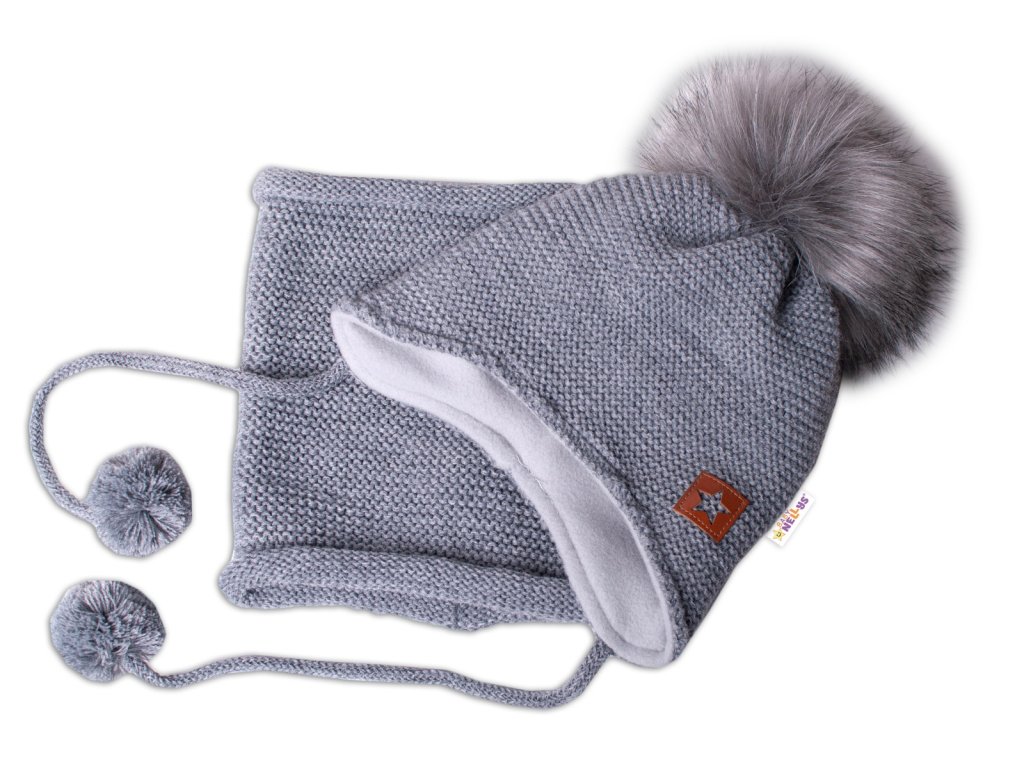Zimní čepice s fleecem a chlupáčková bambule Star + komínek - šedá, BABY NELLYS