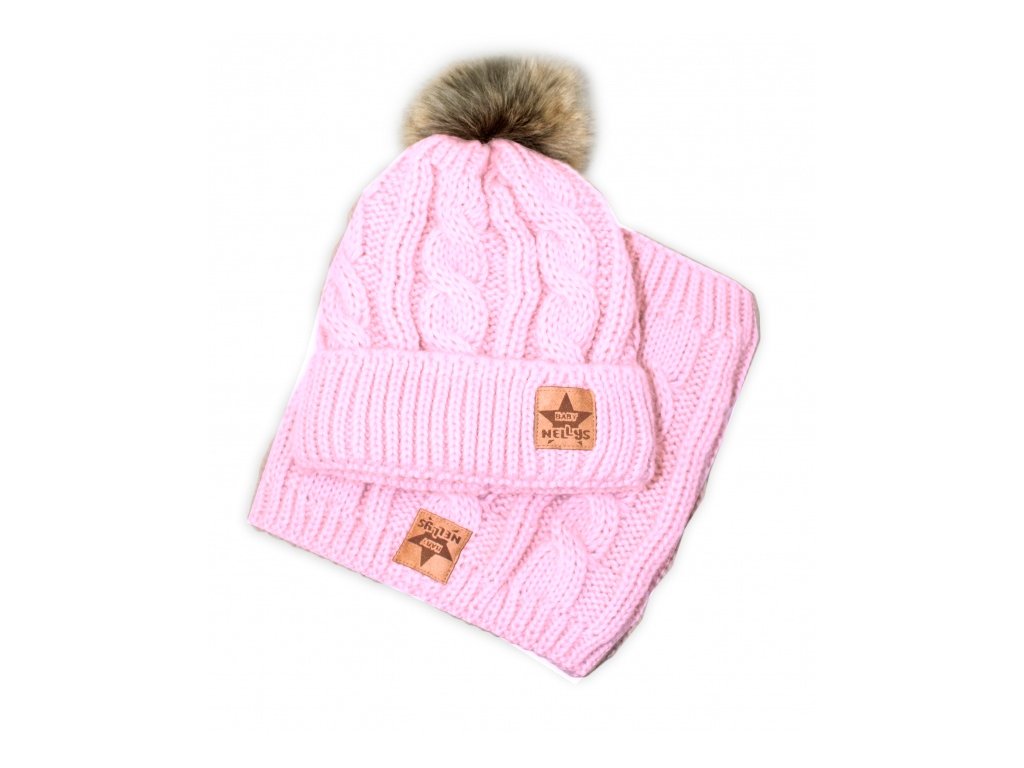Zimní pletená čepice s bambulí + komínek, světle růžová