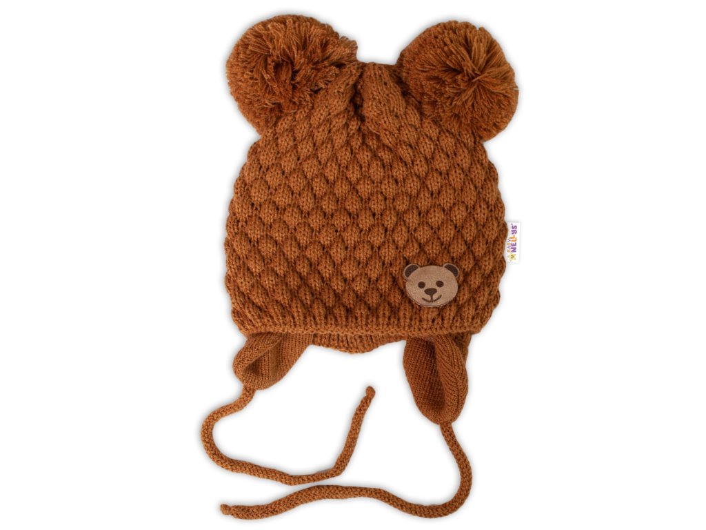 Zimní pletená čepice Teddy Bear na zavazování, hnědá, Baby Nellys