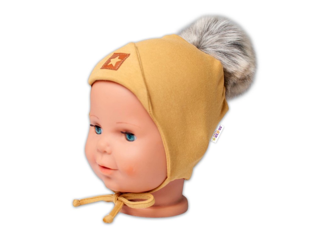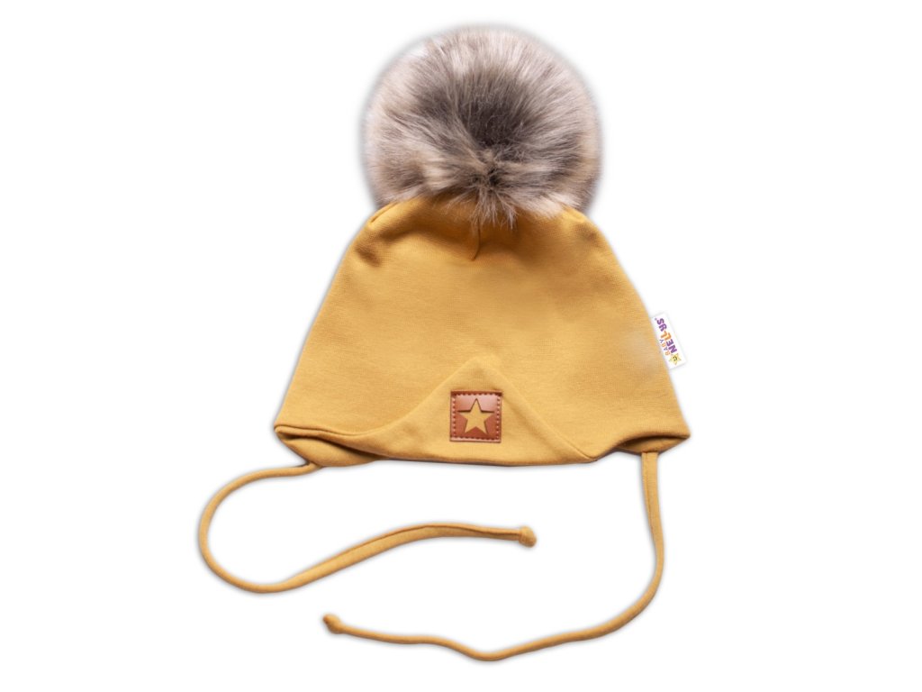 Zimní,podzimní bavlněná dvouvrstvá čepice s bambulí na zavazování Star, hořčicová
