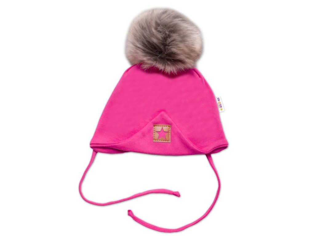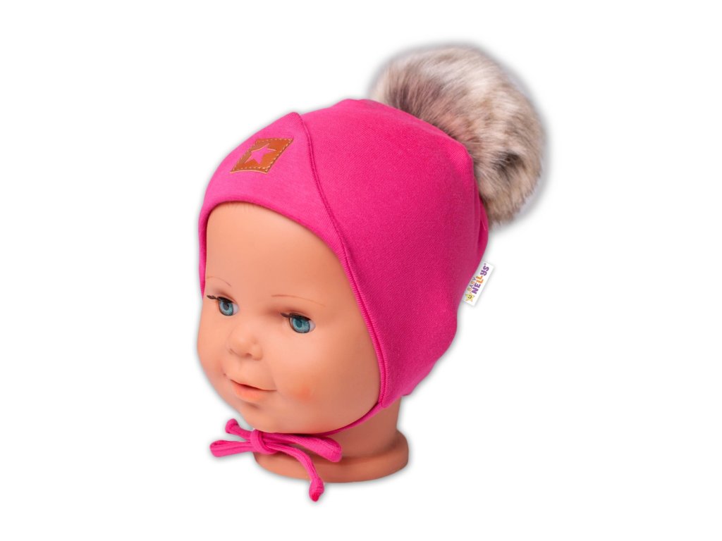 Zimní,podzimní bavlněná dvouvrstvá čepice s bambulí na zavazování Star, růžová